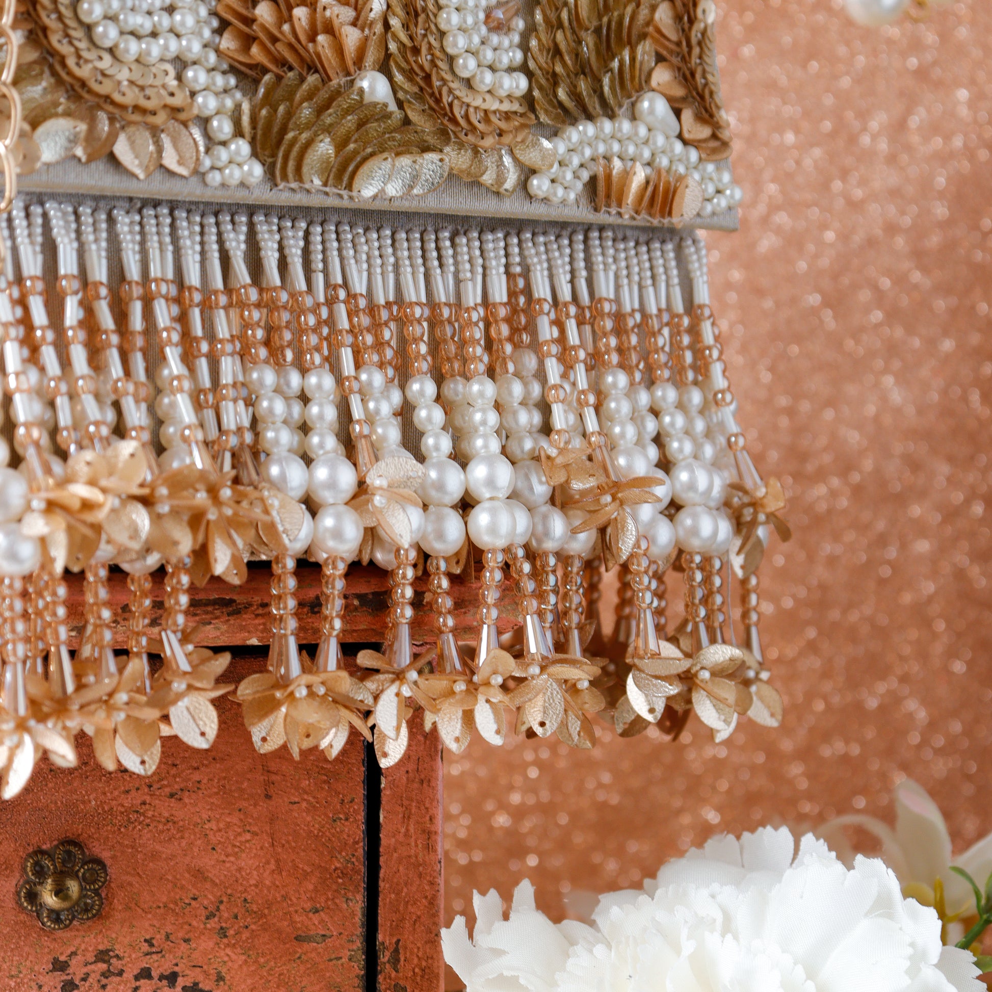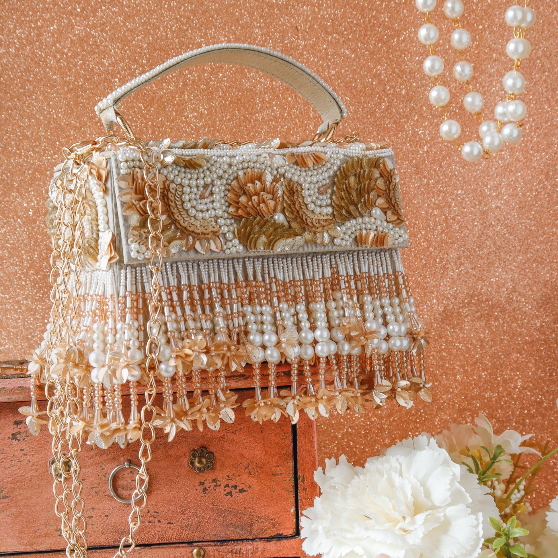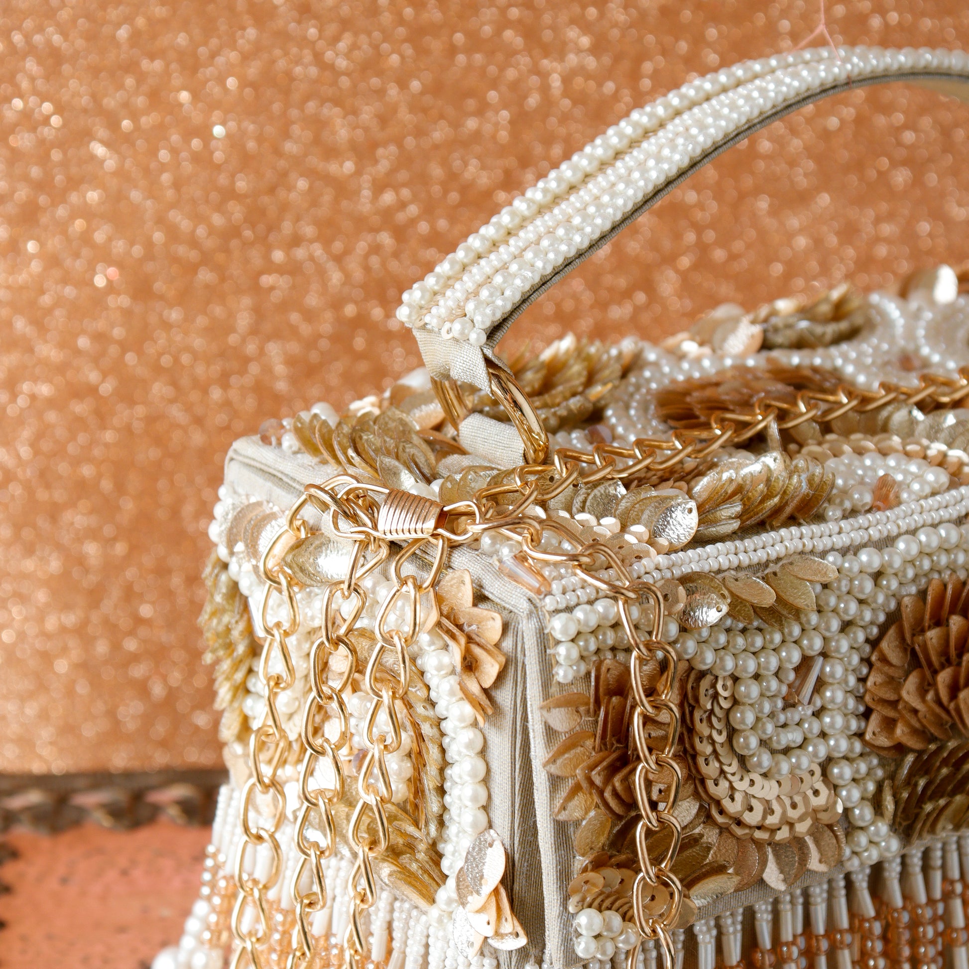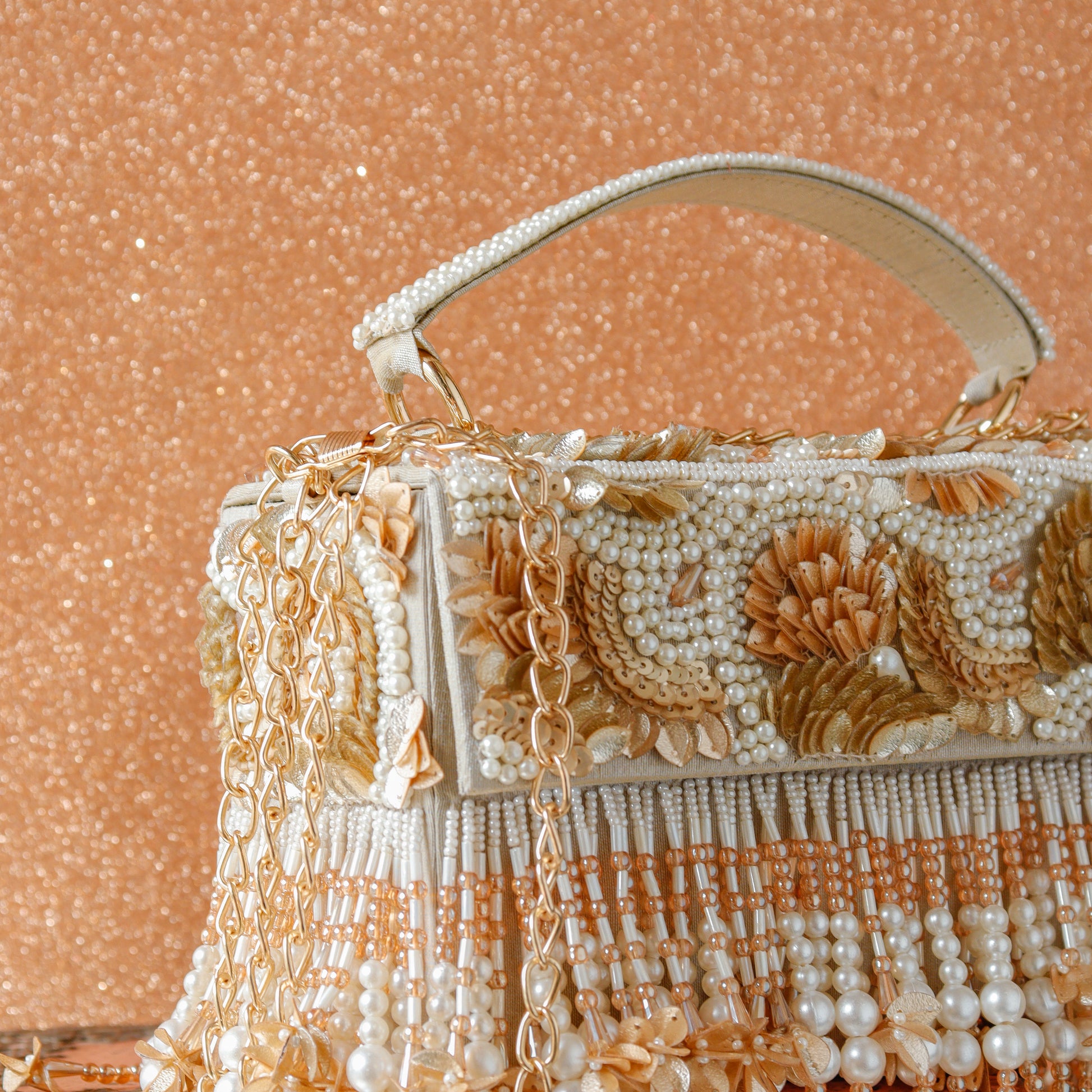 Hand embroidered and hand embellished bag with sling chain. A one of a kind accessory, that will add glam to your outfit. Color - Multicolour