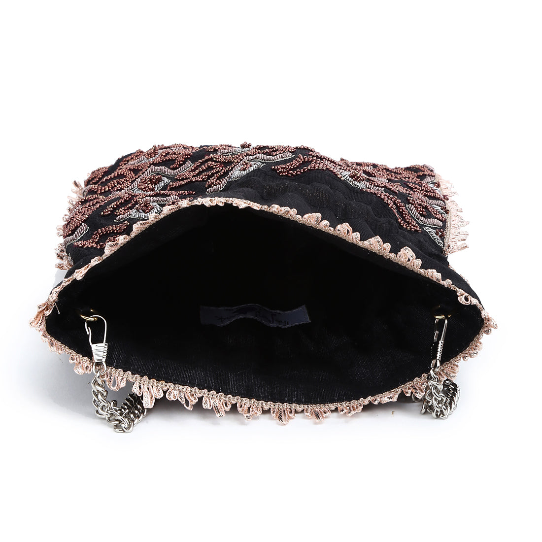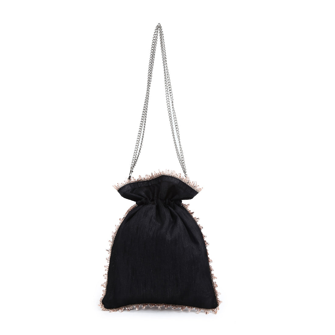 Gorgeous hand embroidery potli, that comes with a detachable sling chain. Carry it with the chain or the drawstring. Color - Black