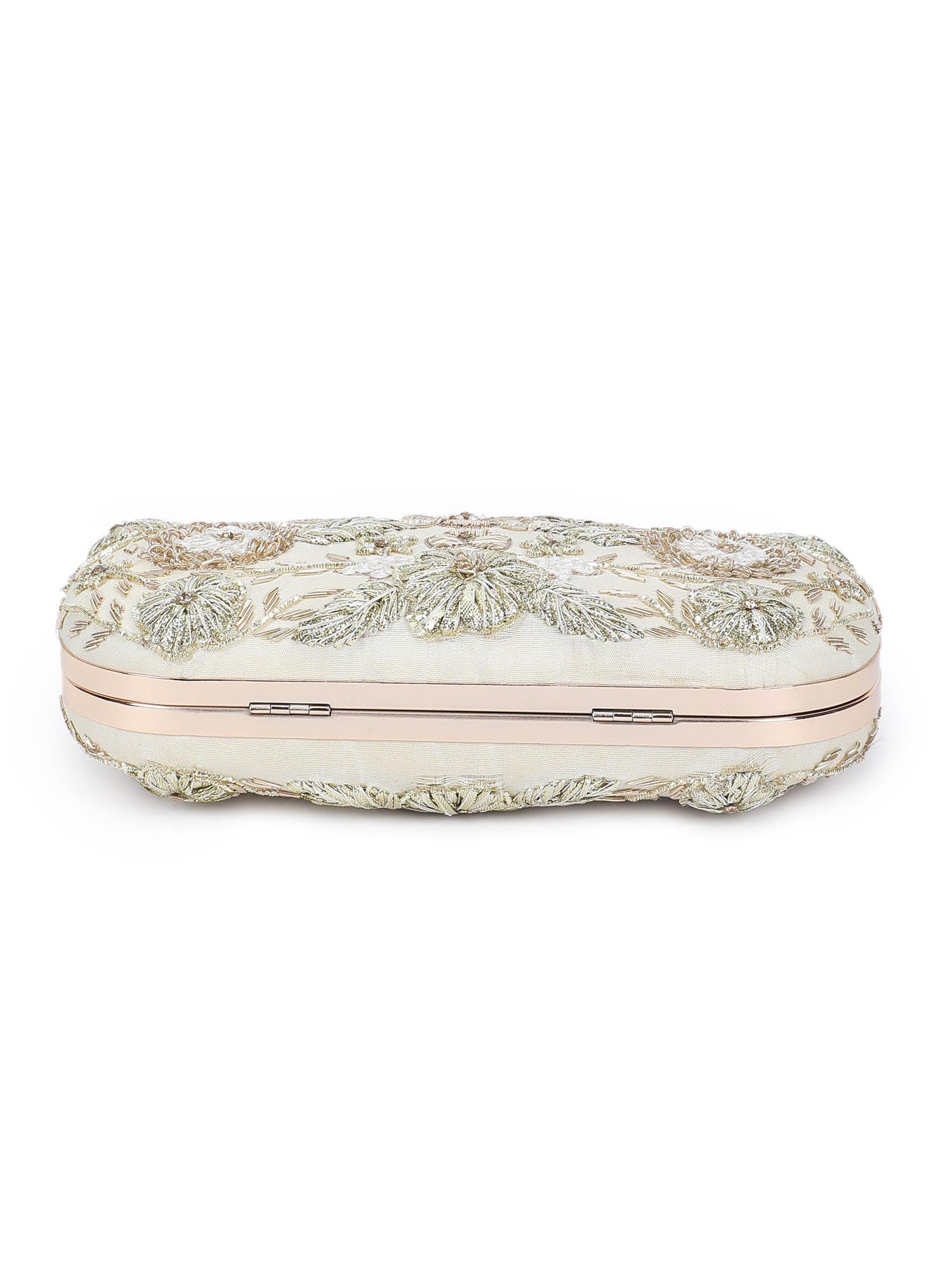 Hand embroidered clutch bag with detachable chain.