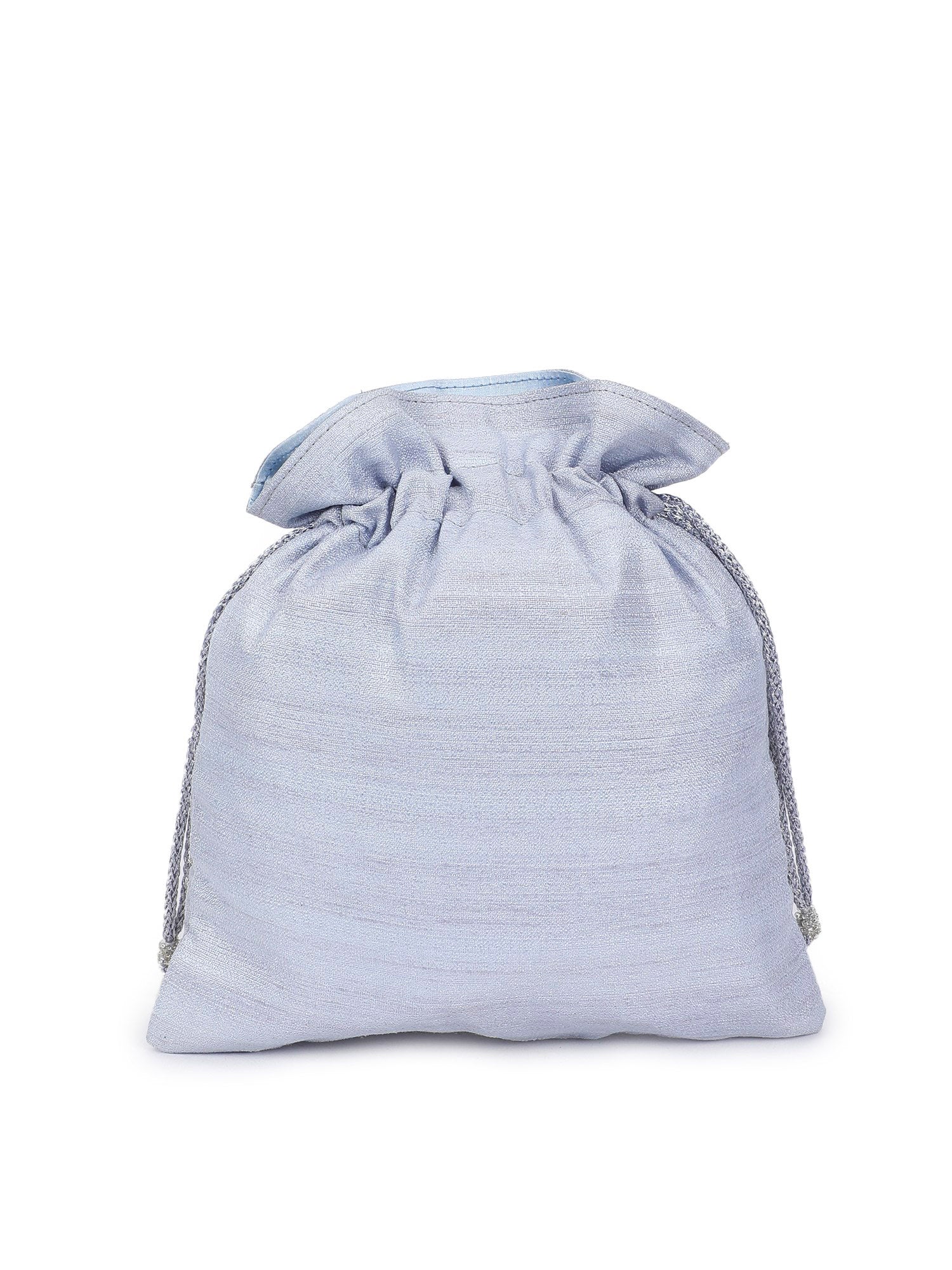 Gorgeous hand embroidery potli, that comes with a detachable sling chain. Carry it with the chain or the drawstring. Color - Silver