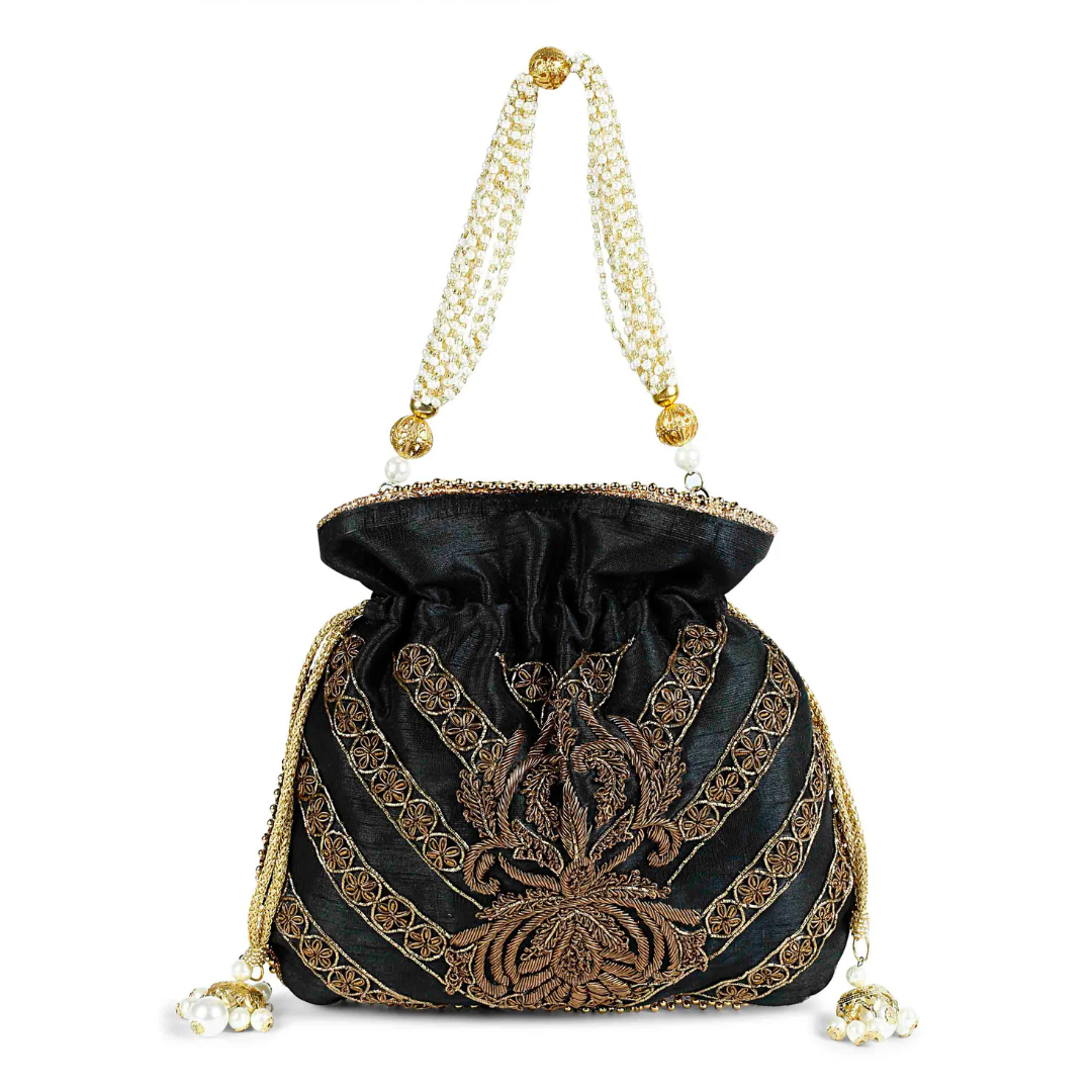 Gorgeous hand embroidery potli, that comes with a detachable sling chain. Carry it with the chain or the drawstring. Color - Black