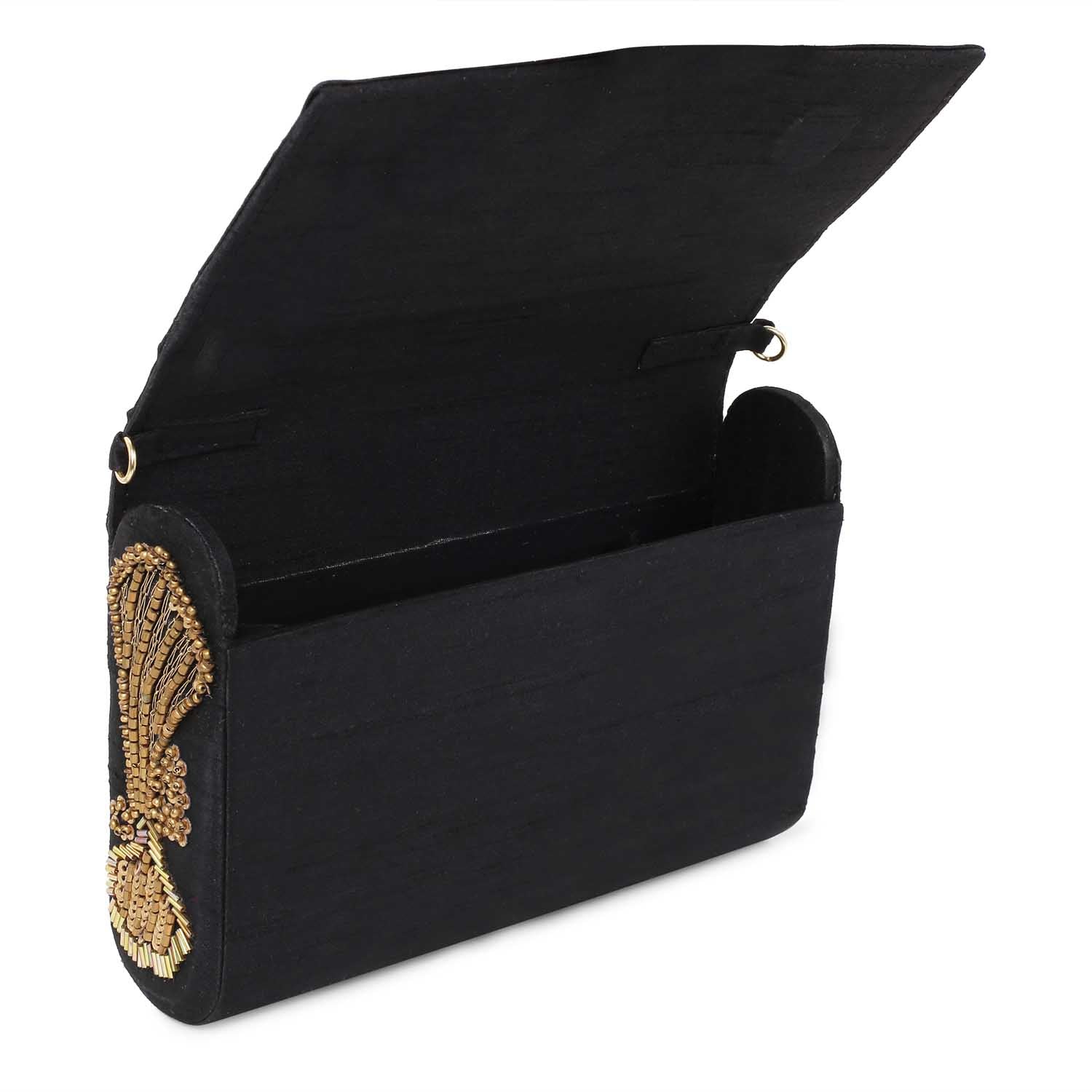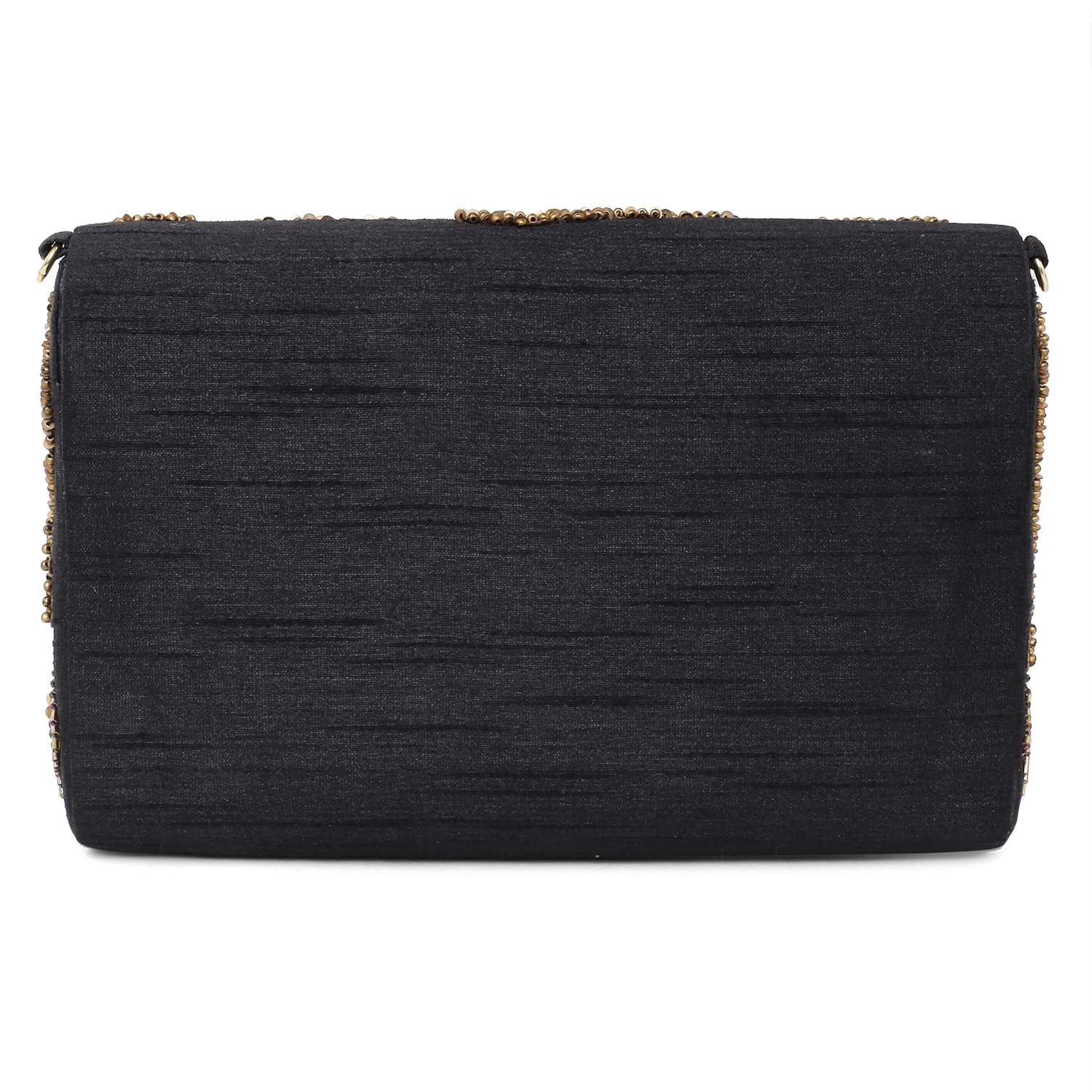 Hand embroidered clutch bag with detachable chain.