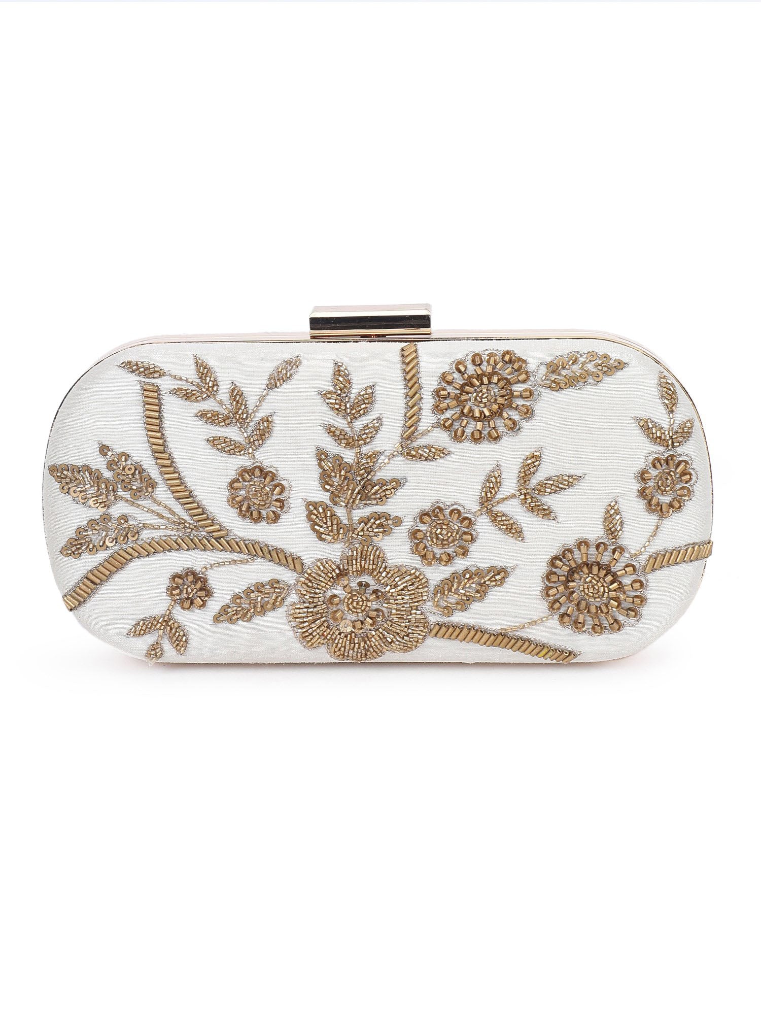 With scintillating design and hand embroidery this clutch bag comes with a detachable sling chain. Carry it with the chain or simply clutch it. Color - Beige