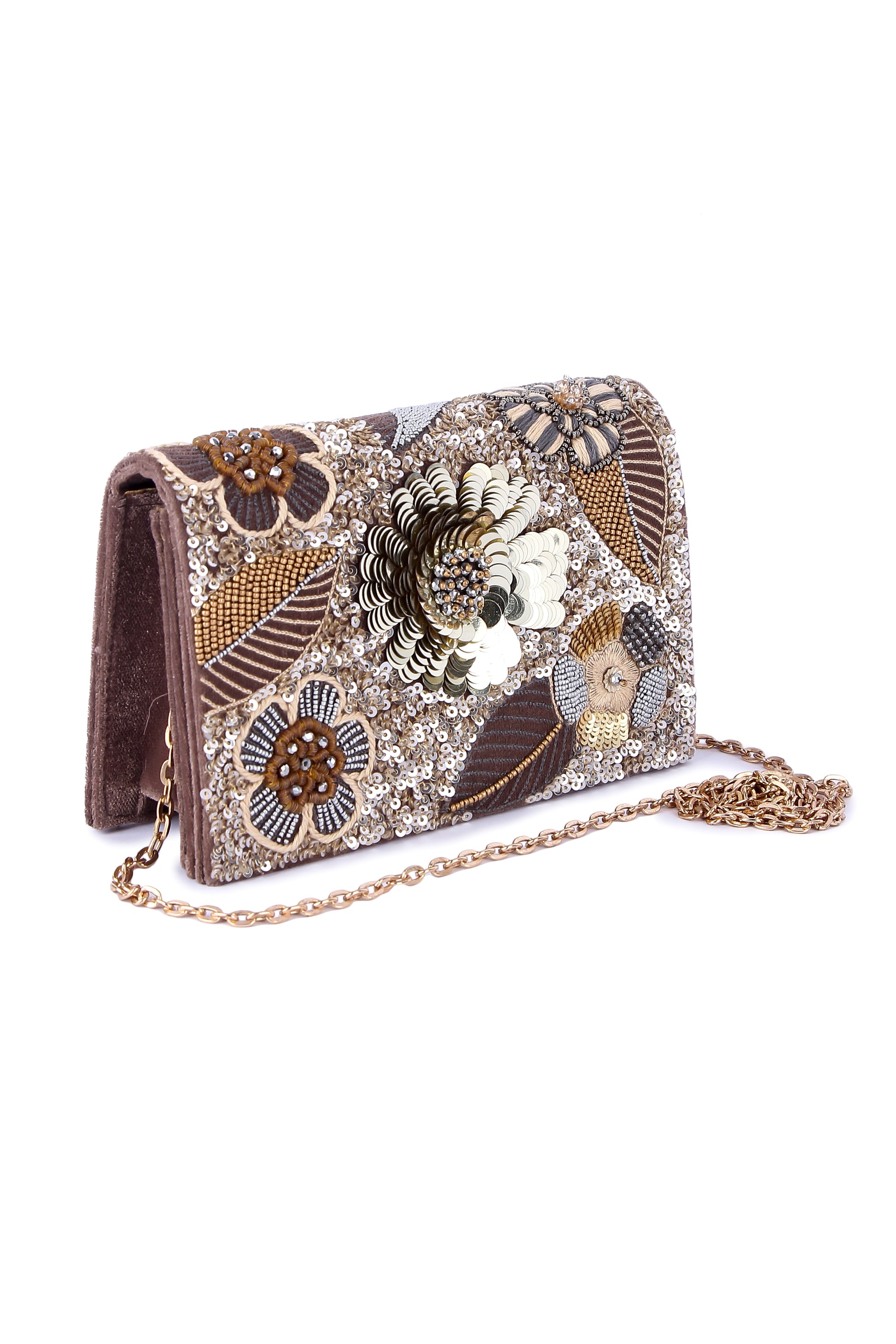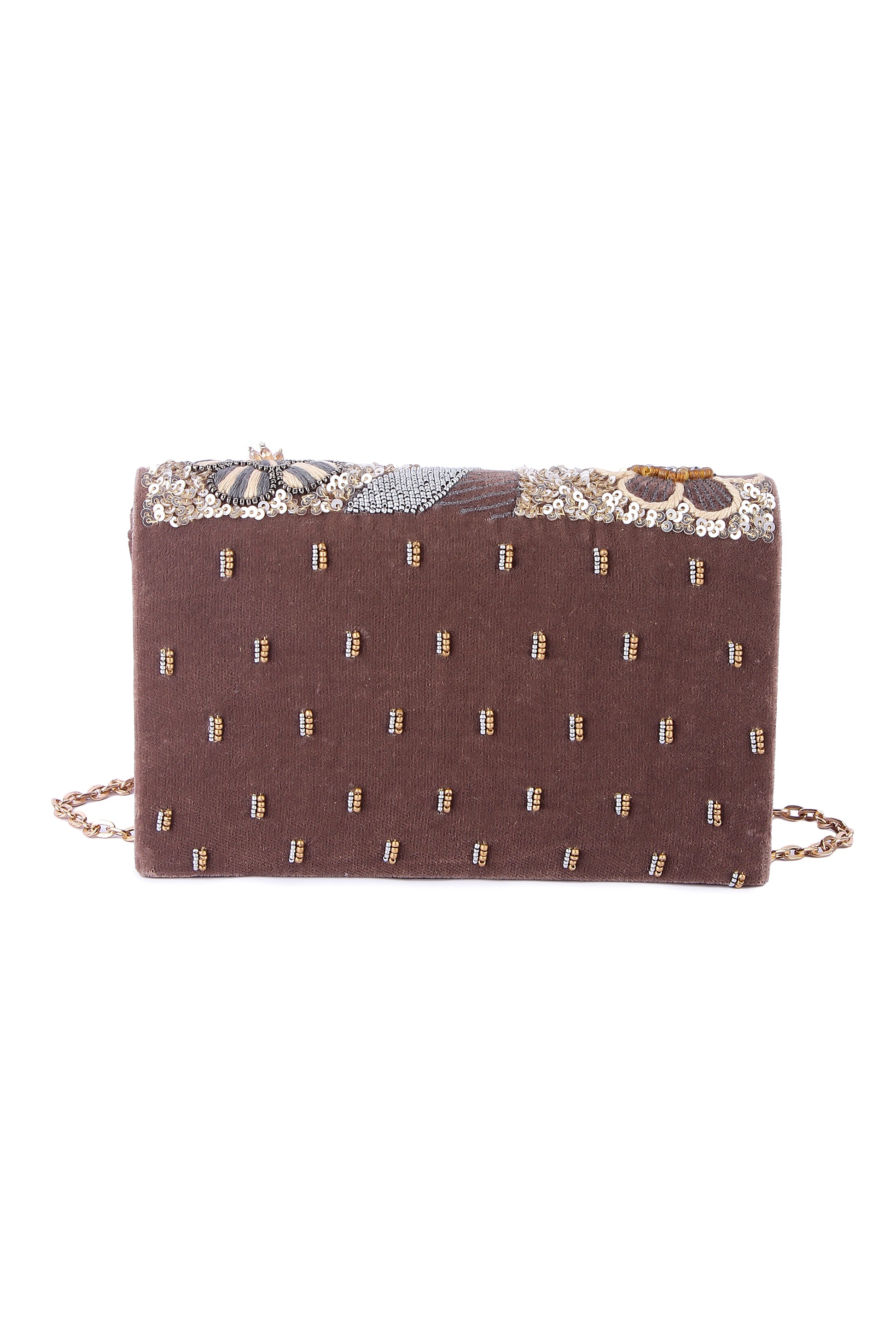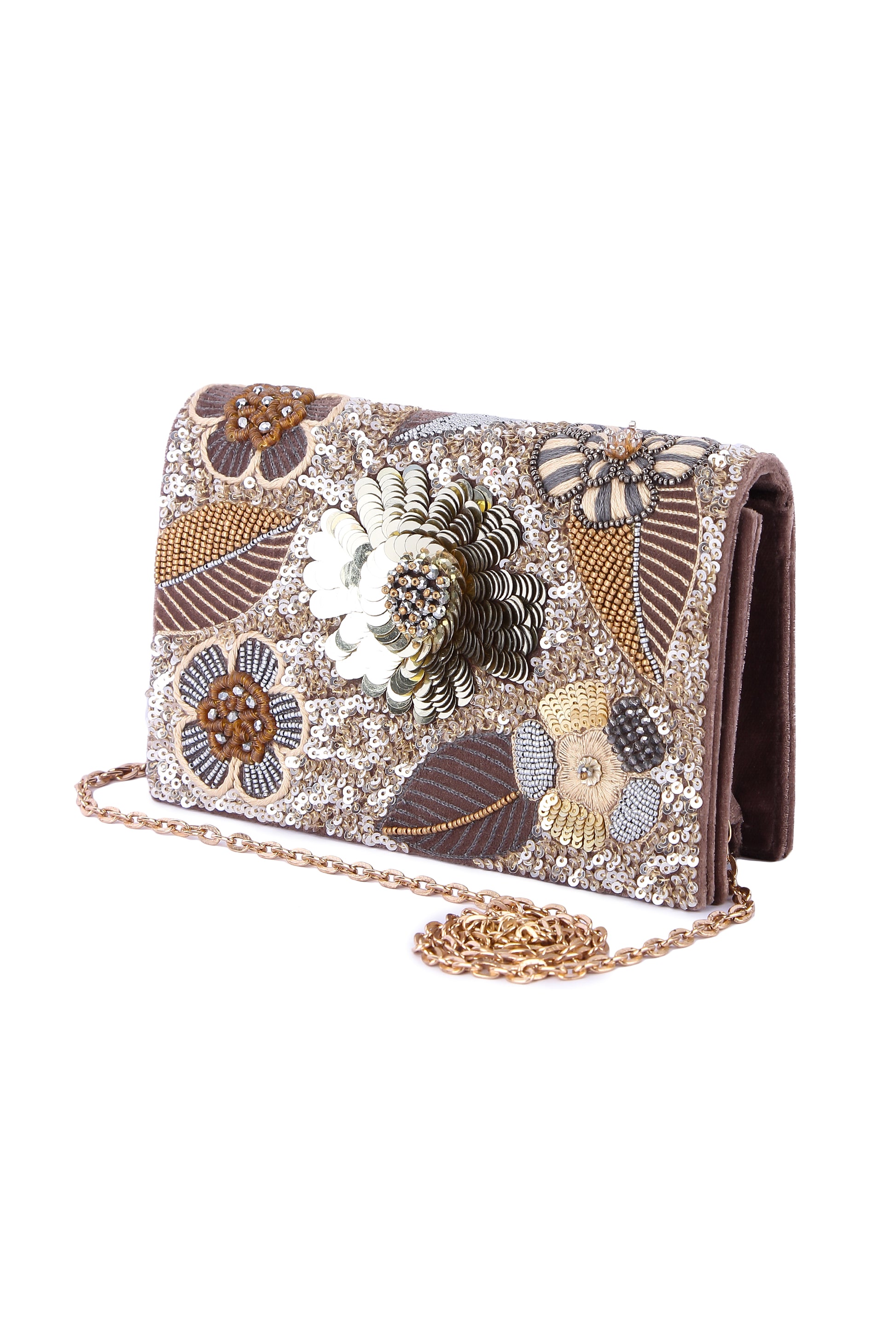 Hand embroidered clutch bag with a detachable sling, which when paired with your outfit completes it.