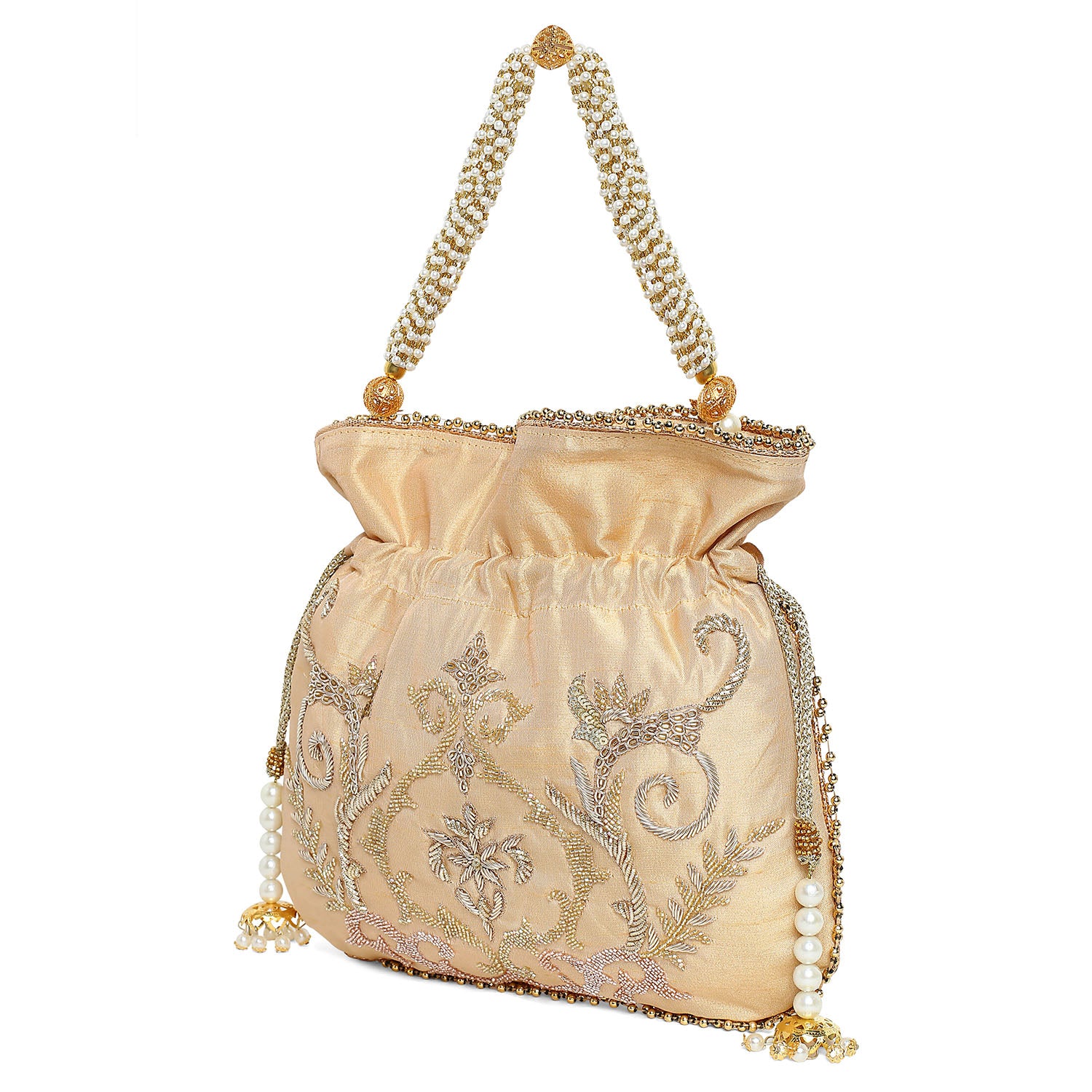 Gorgeous hand embroidery potli, that comes with a detachable sling chain. Carry it with the chain or the drawstring. Color - Golden
