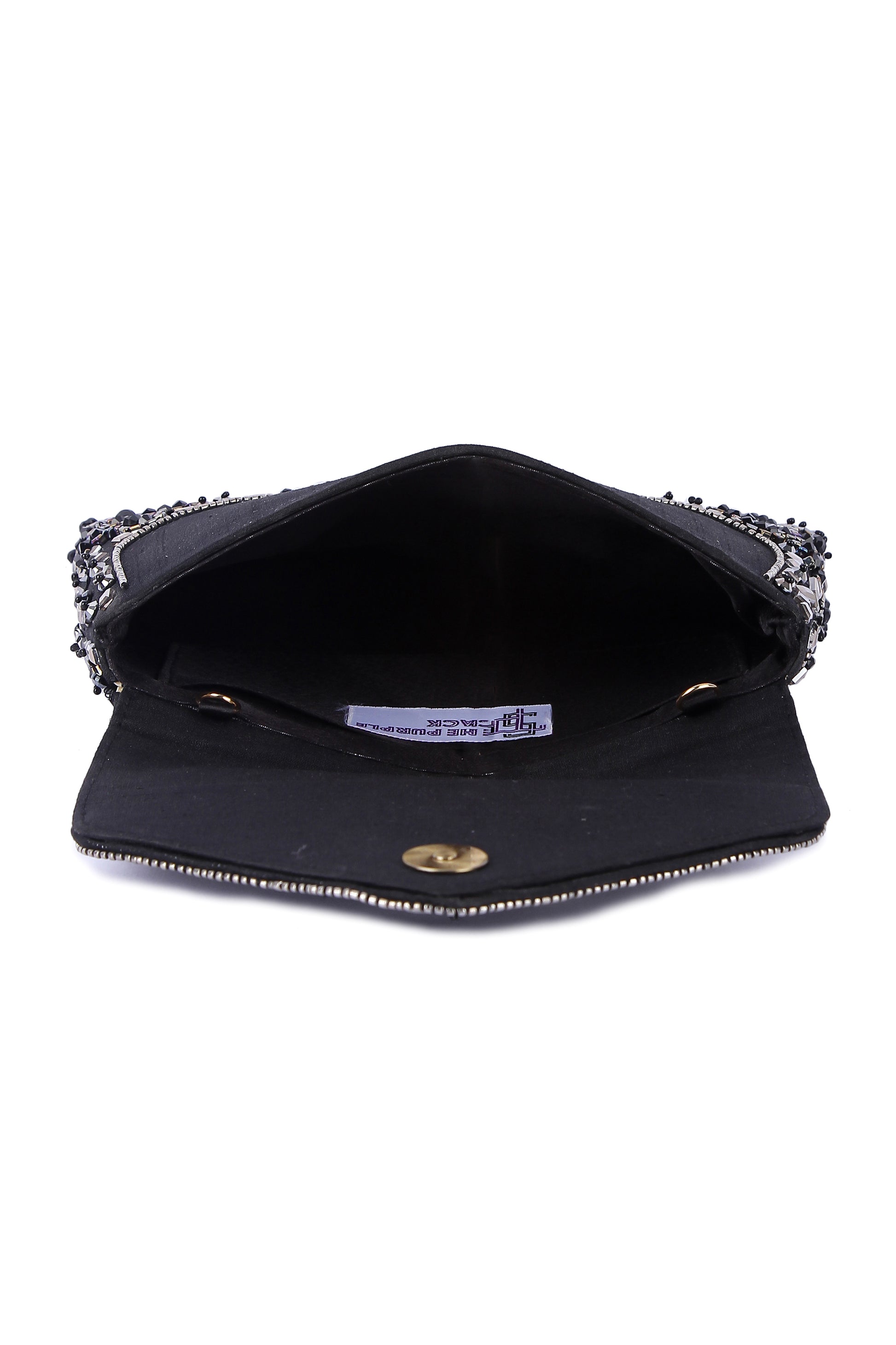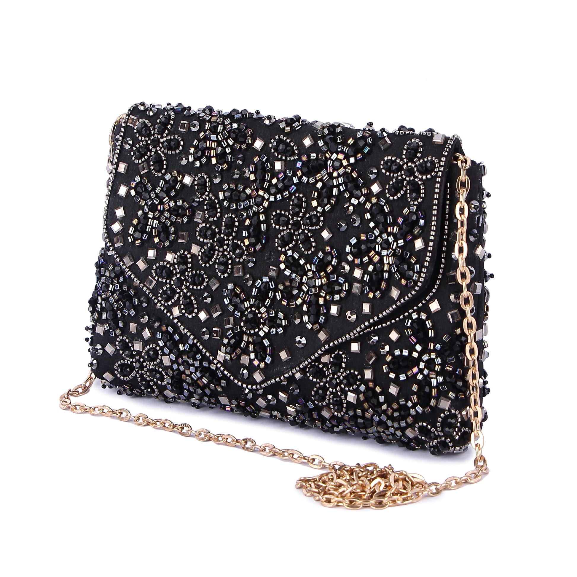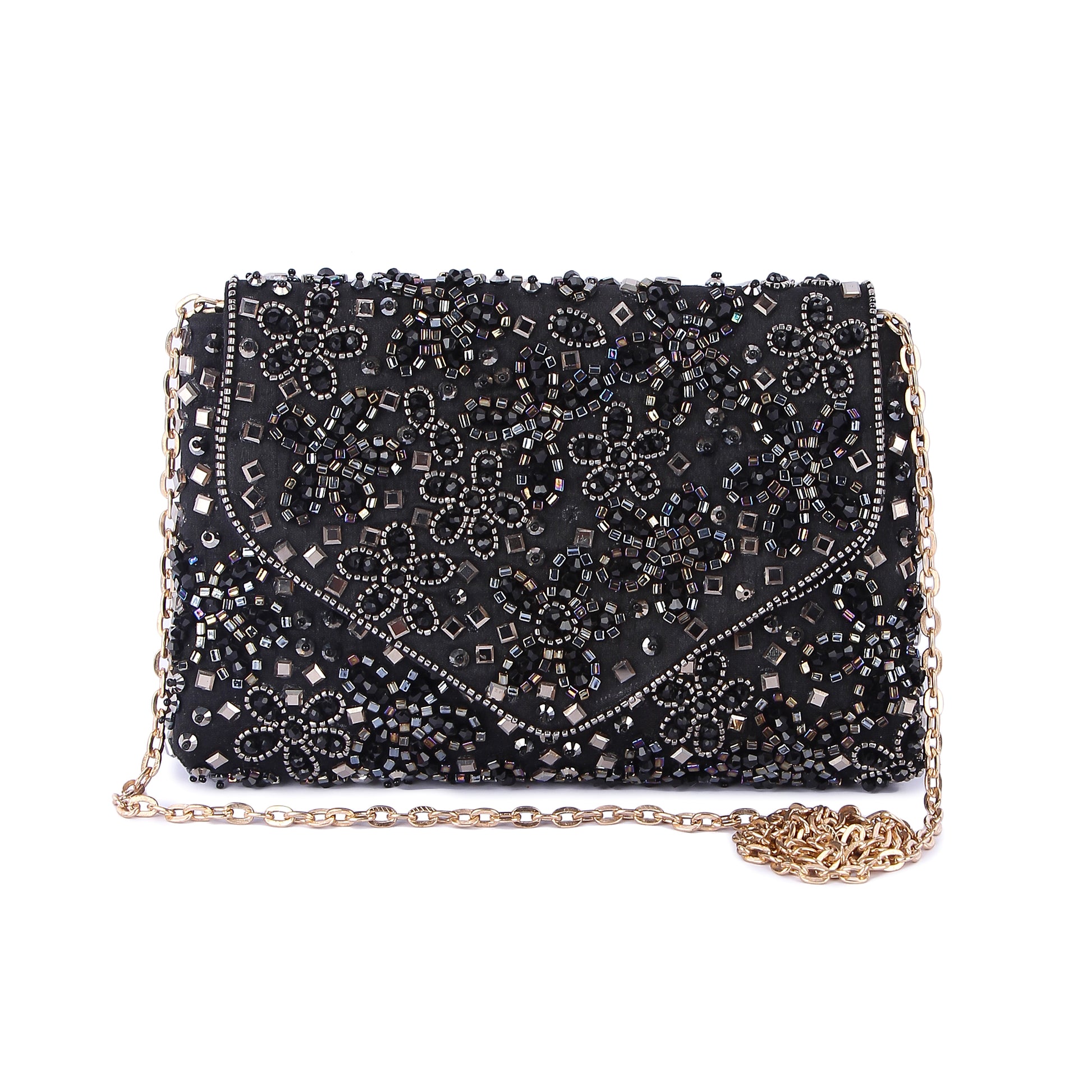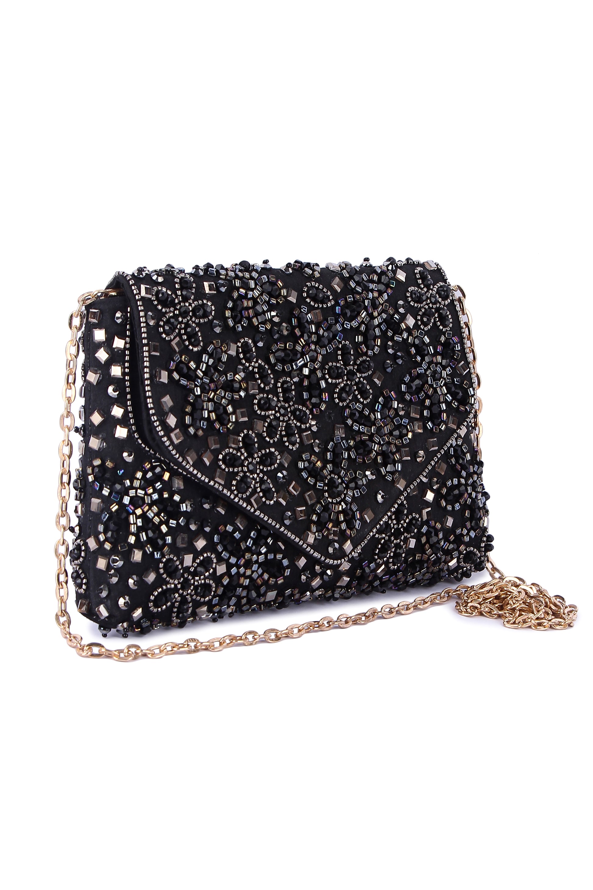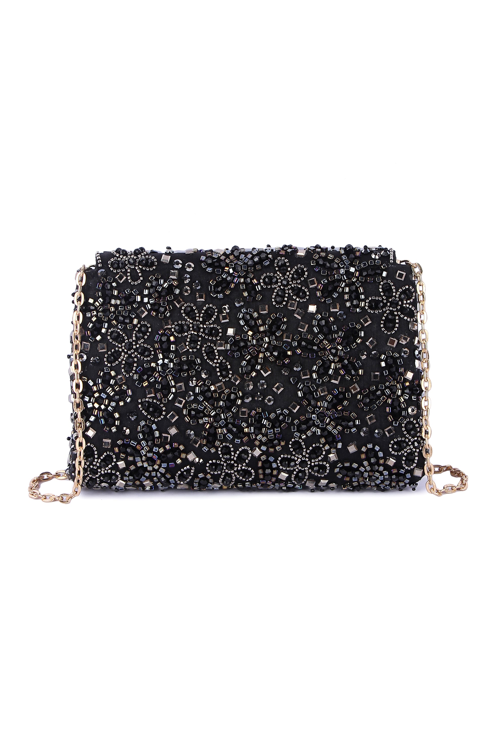 Hand embroidered clutch bag with a detachable sling, which when paired with your outfit completes it.