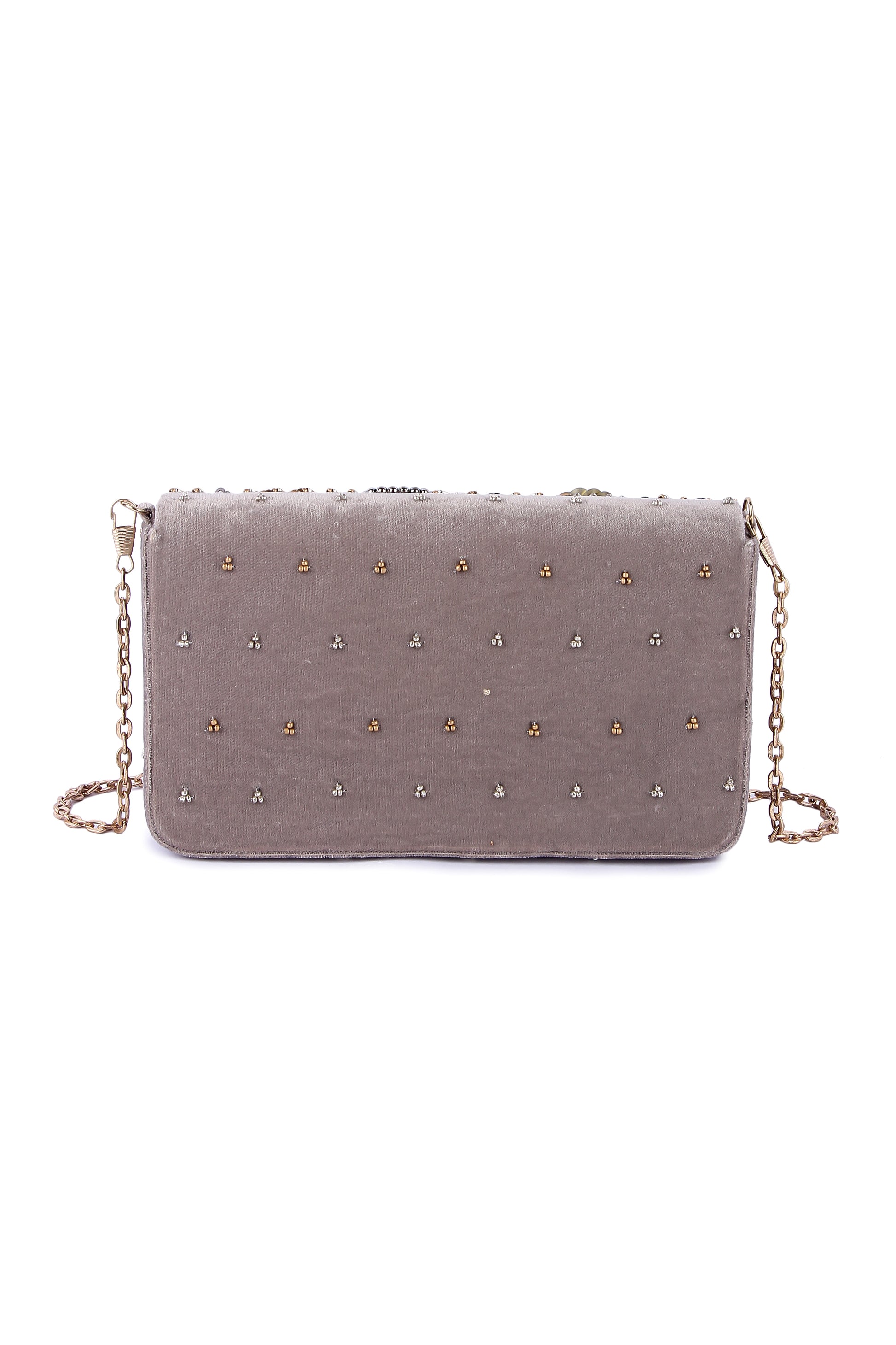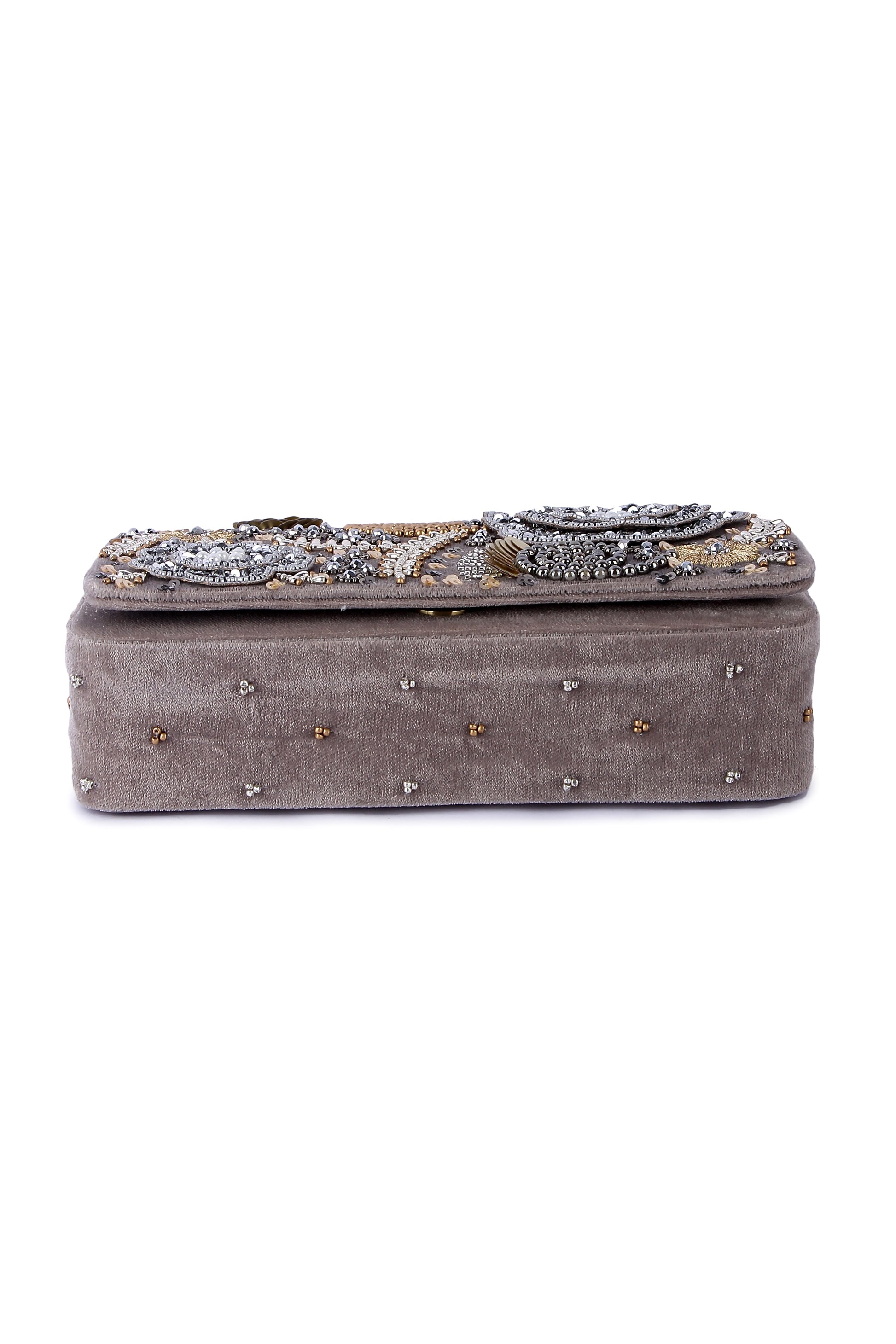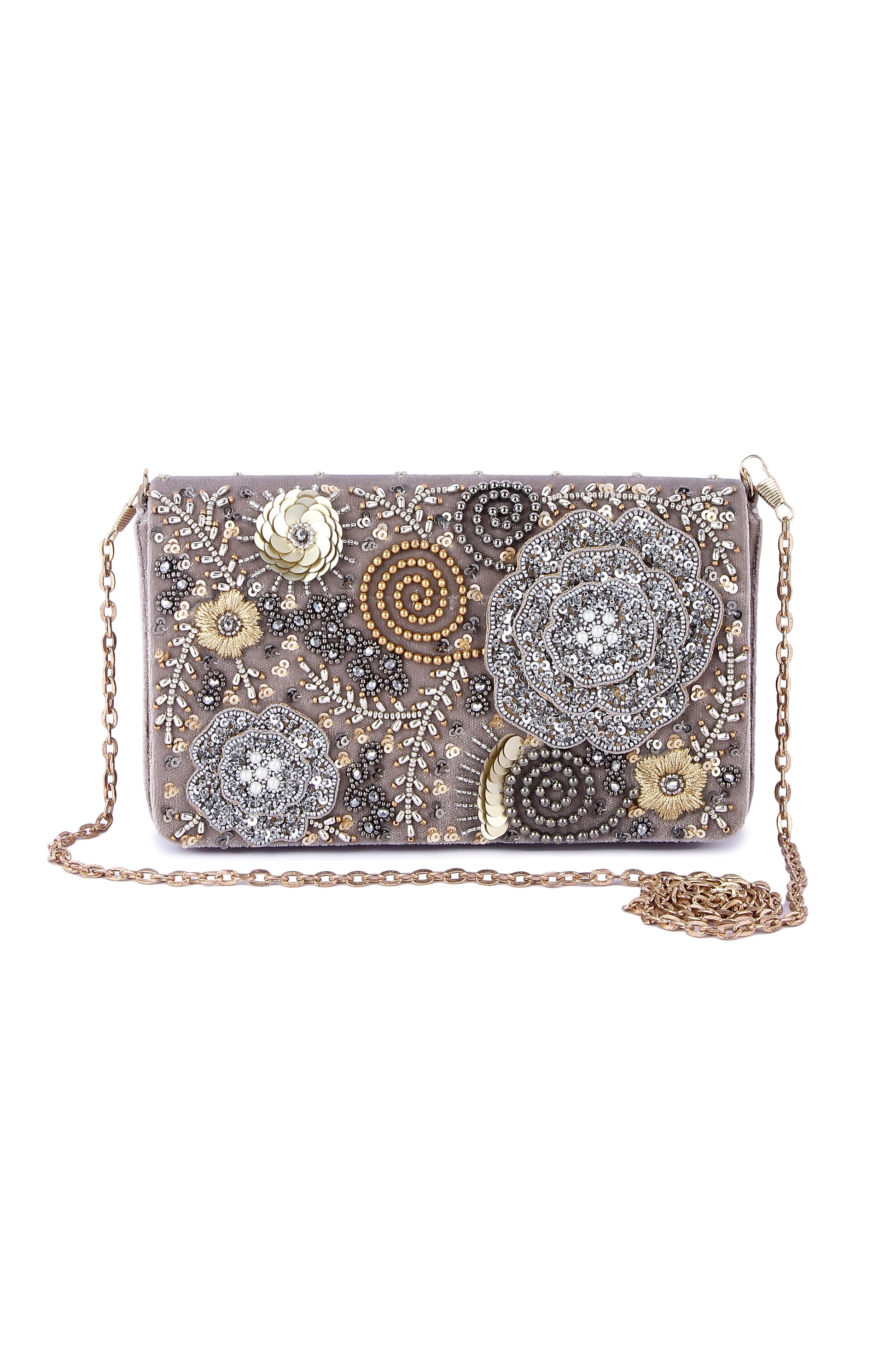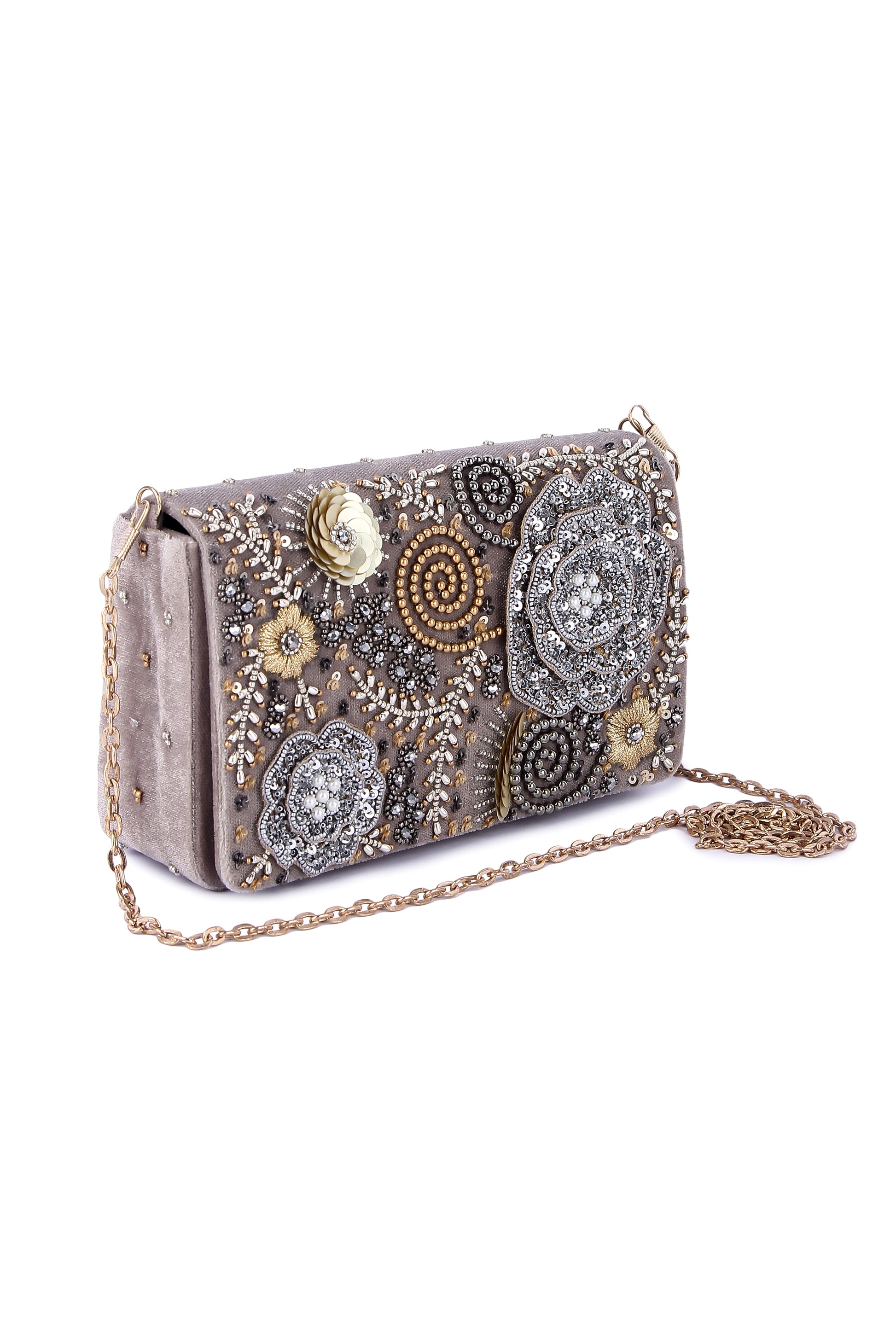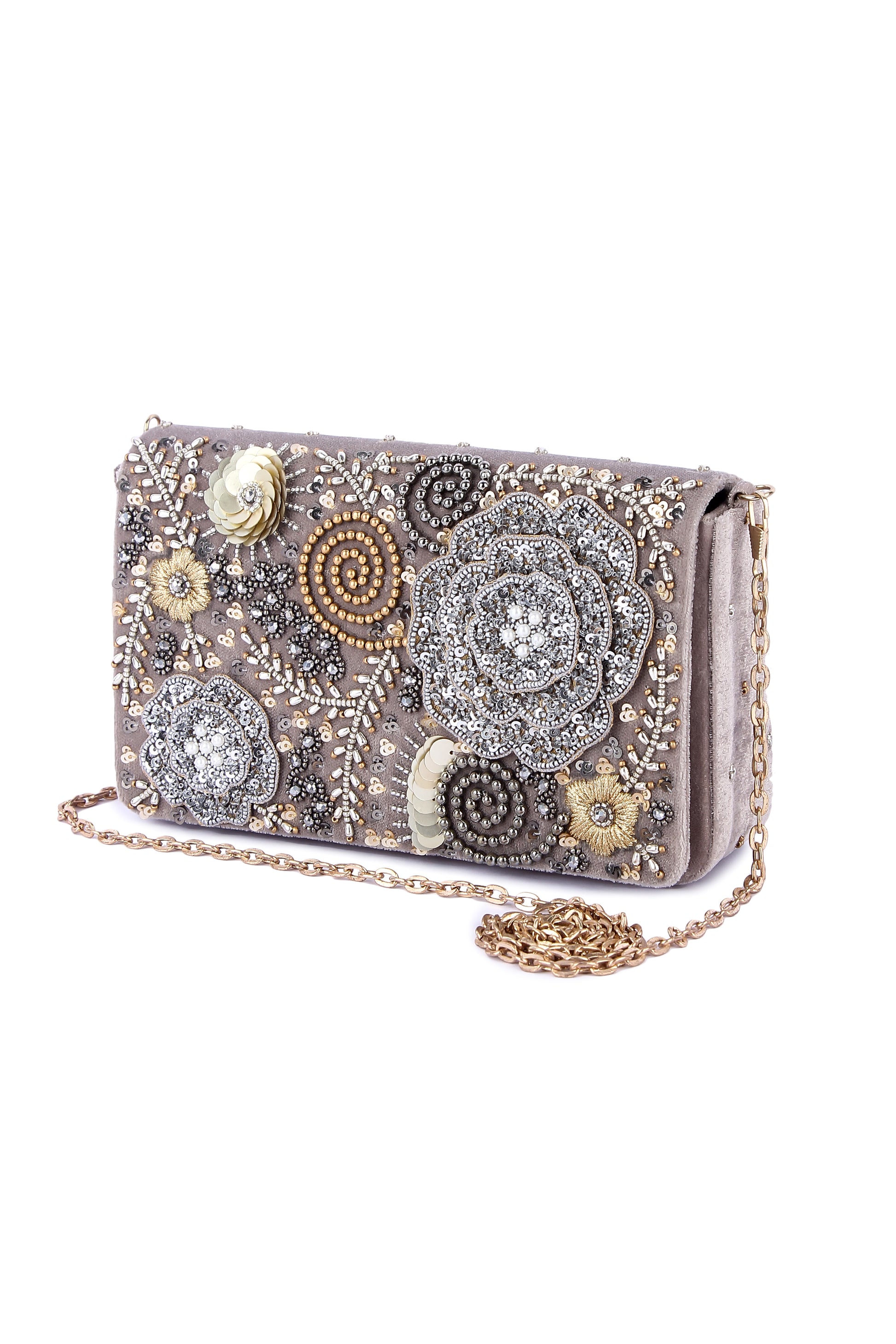 Hand embroidered clutch bag with a detachable sling, which when paired with your outfit completes it.