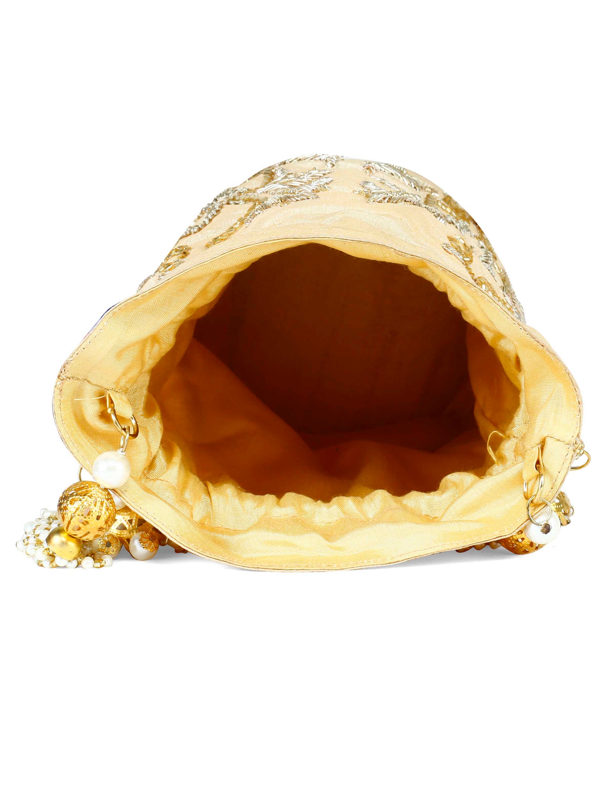 Gorgeous hand embroidery potli, that comes with a detachable sling chain. Carry it with the chain or the drawstring. Color - Golden