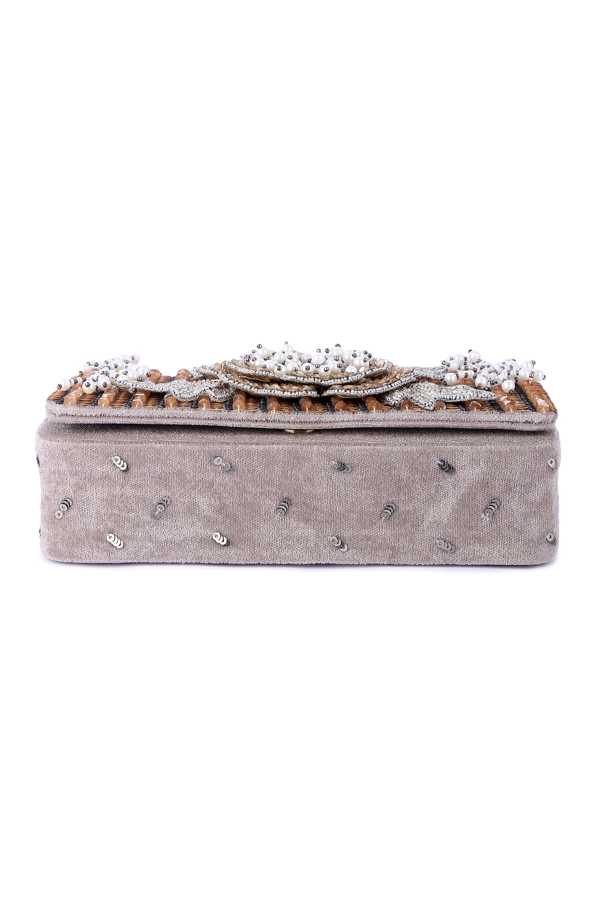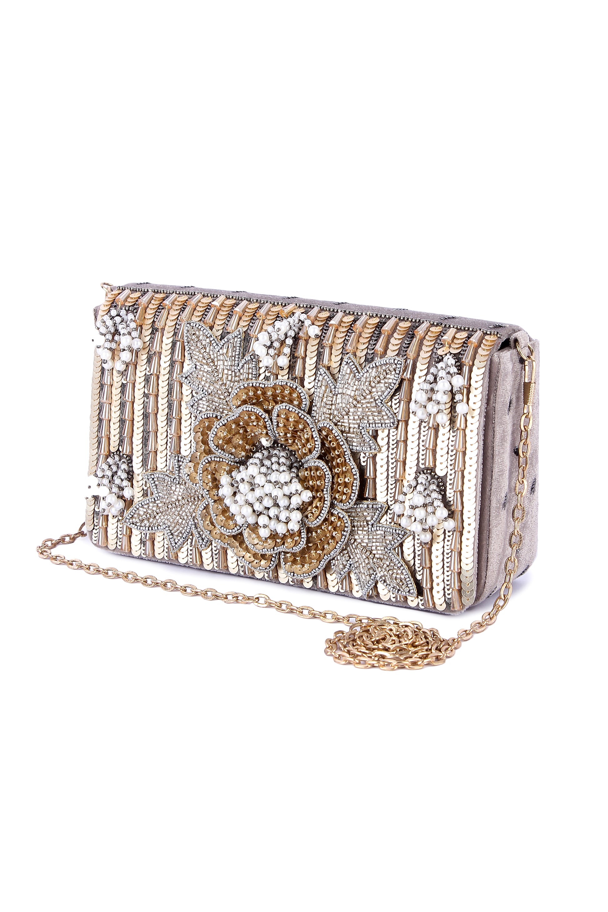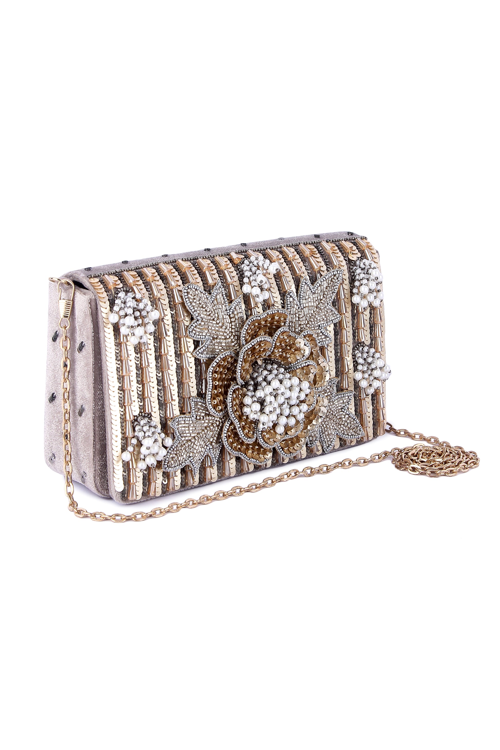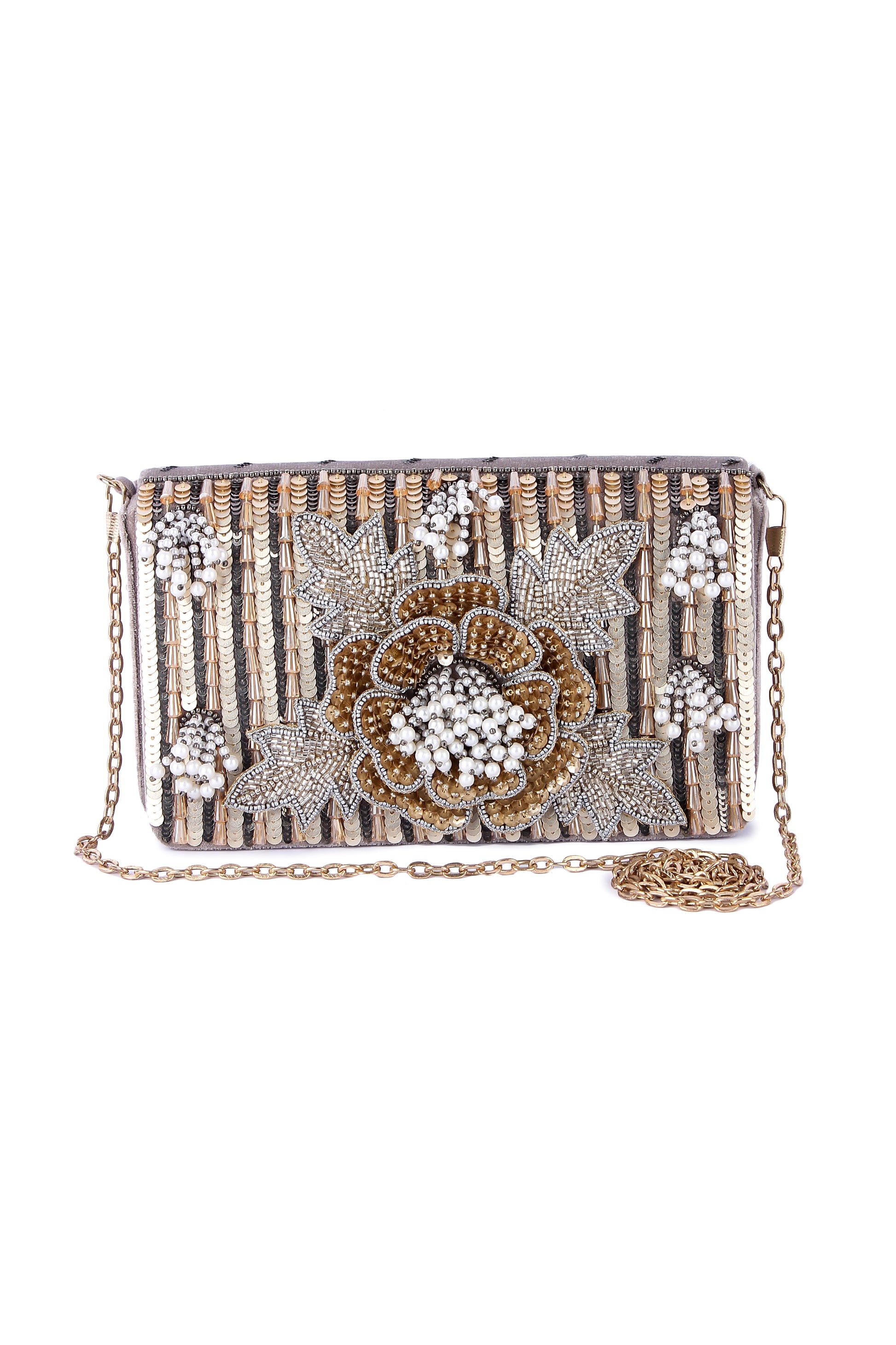 Hand embroidered clutch bag with a detachable sling, which when paired with your outfit completes it.