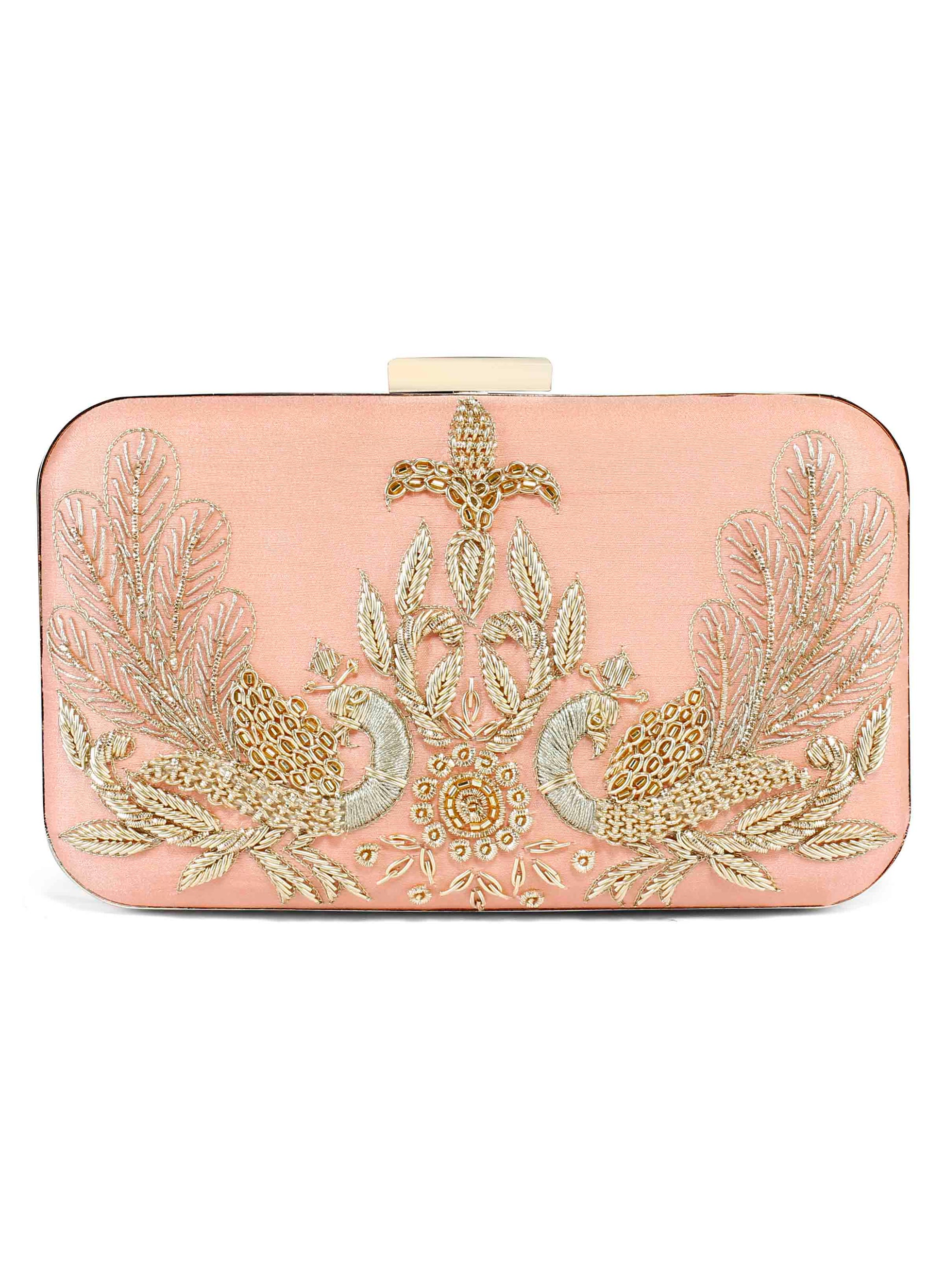 A gorgeous clutch bag with a pair of peacocks, on either side. Looks gorgeous with any coloured outfit.  Color - Peech