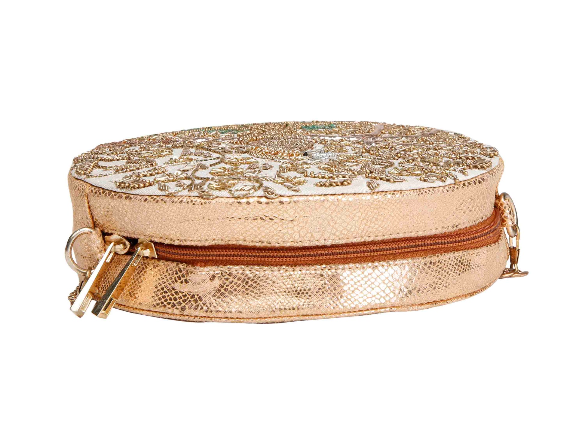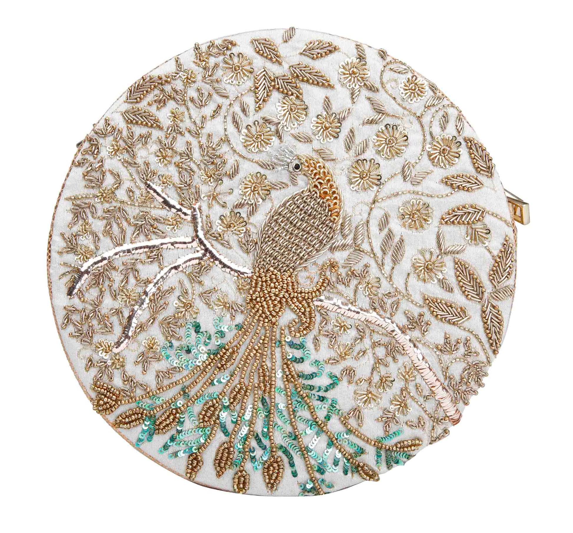 A round sling bag which features a gorgeous peacock design,this one is for those who like to carry a sling bag and be hassle free at weddings. Color - Multicolour