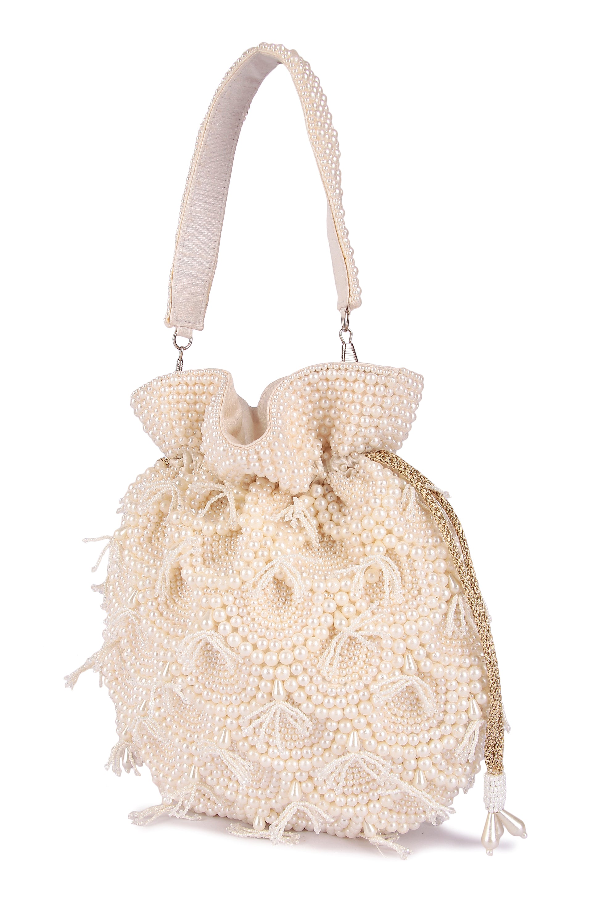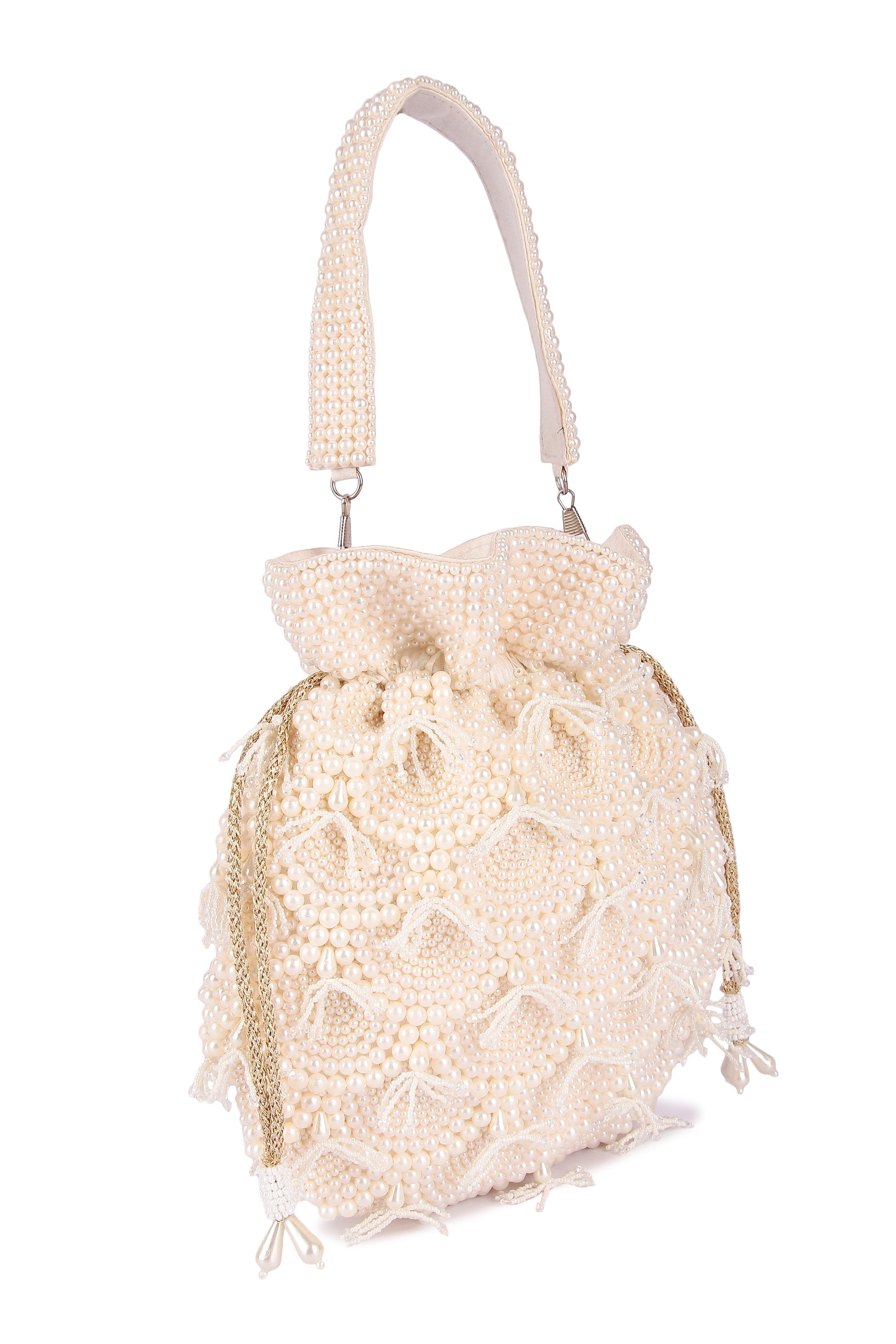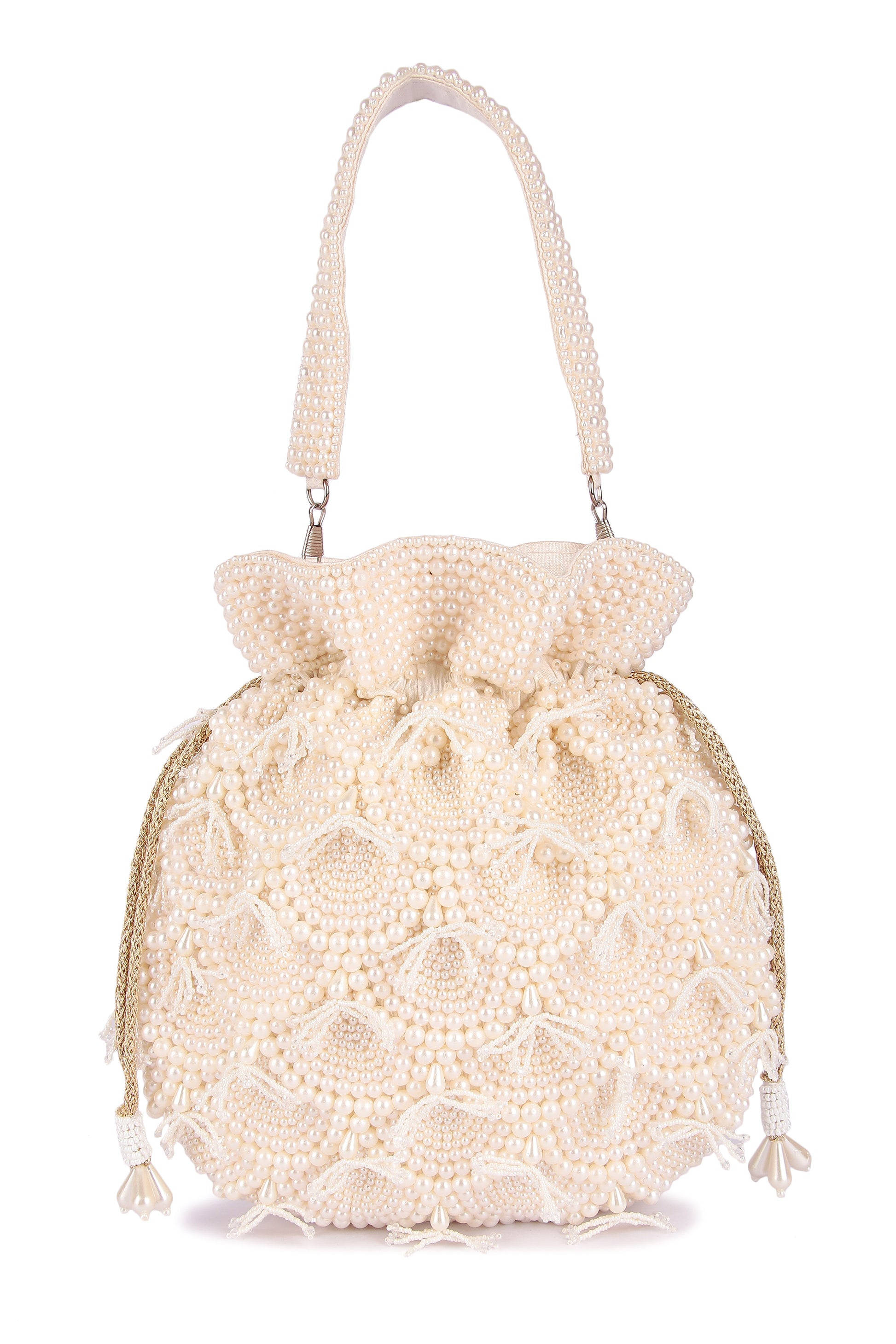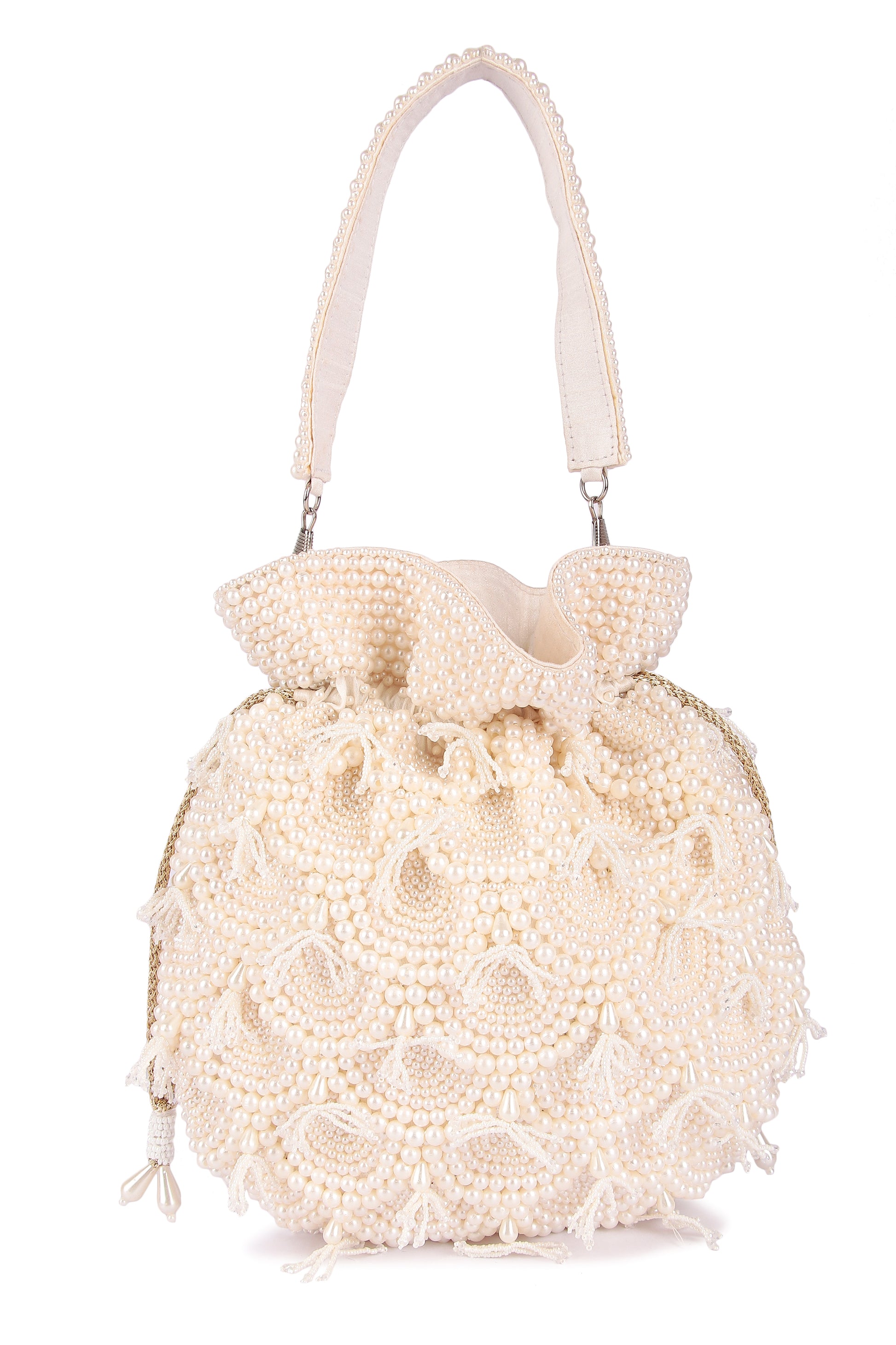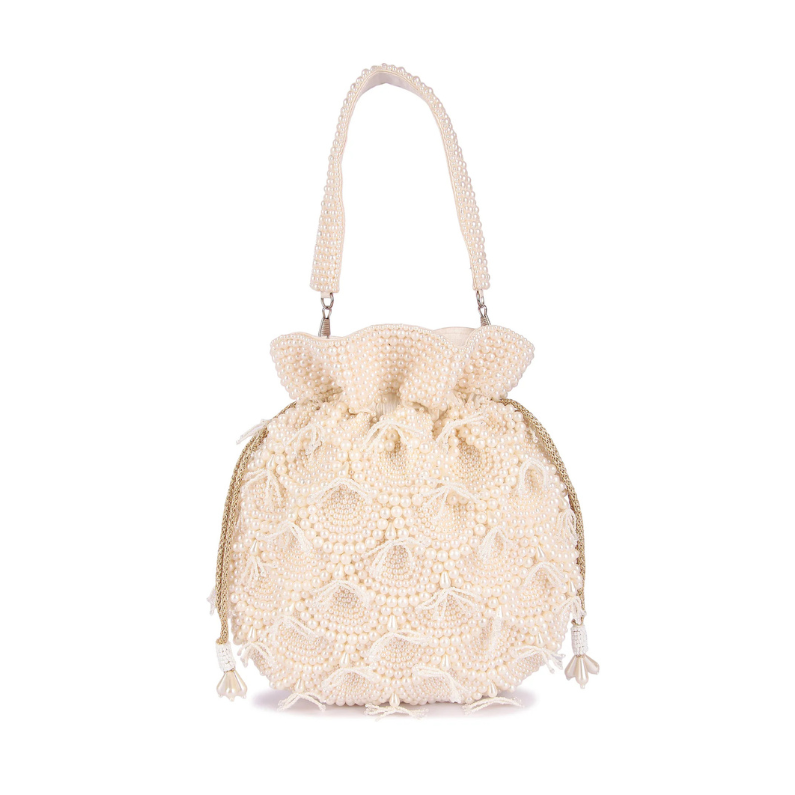 Hand embroidered classy pearl potli with detachable handle and draw strings finished with beautiful tassels.