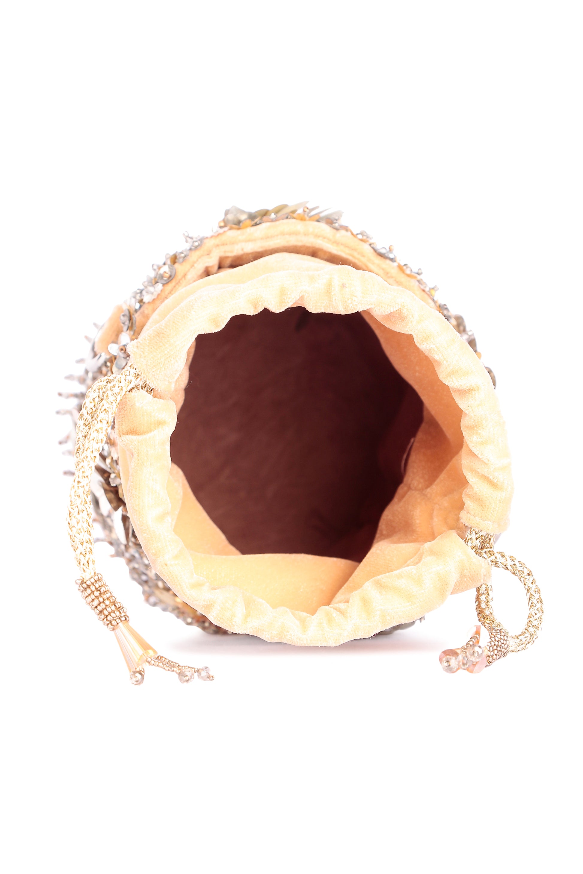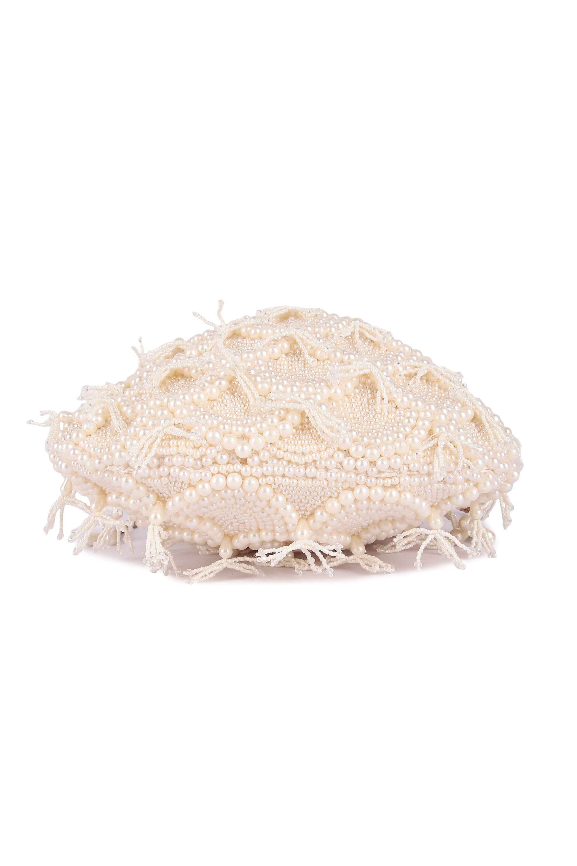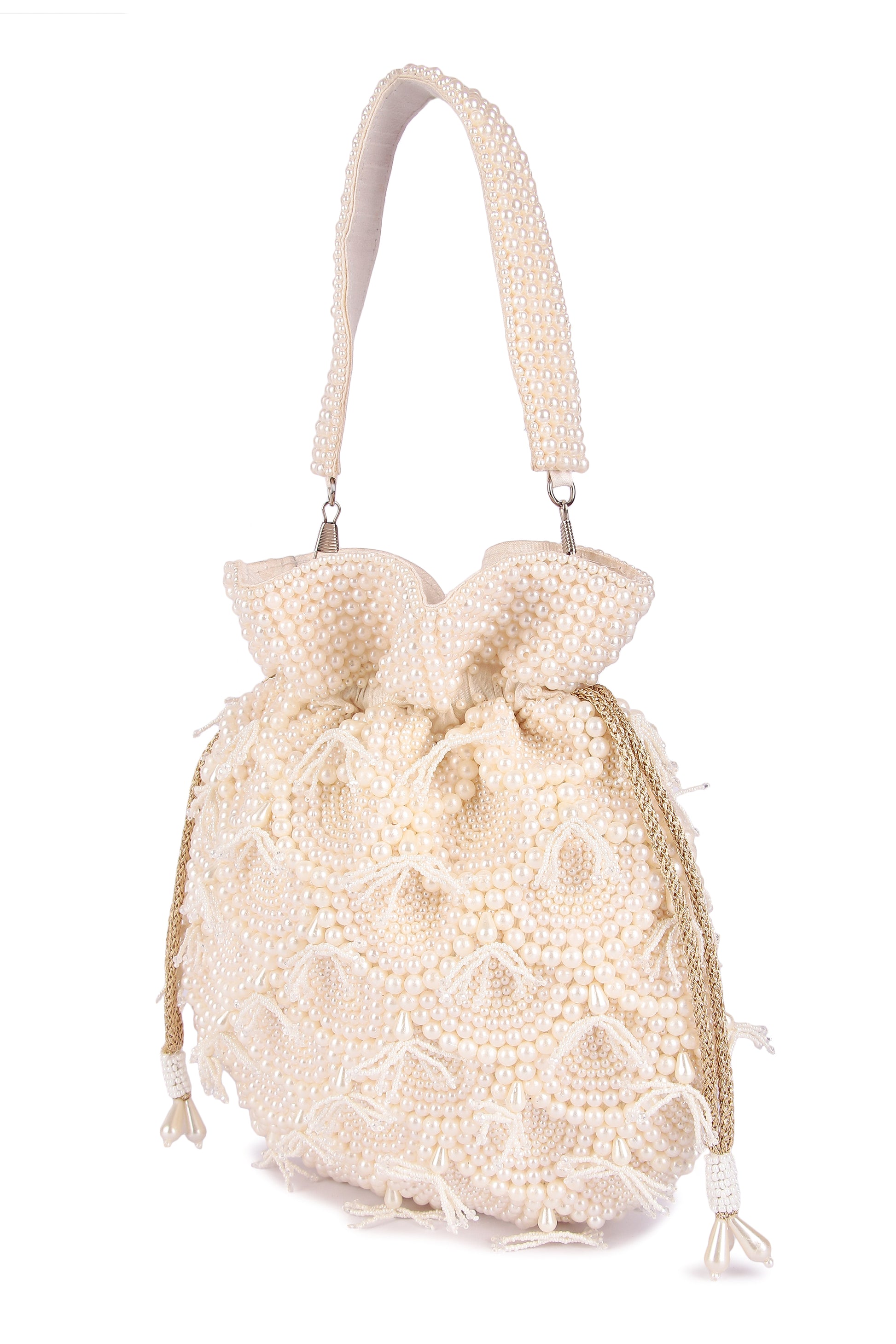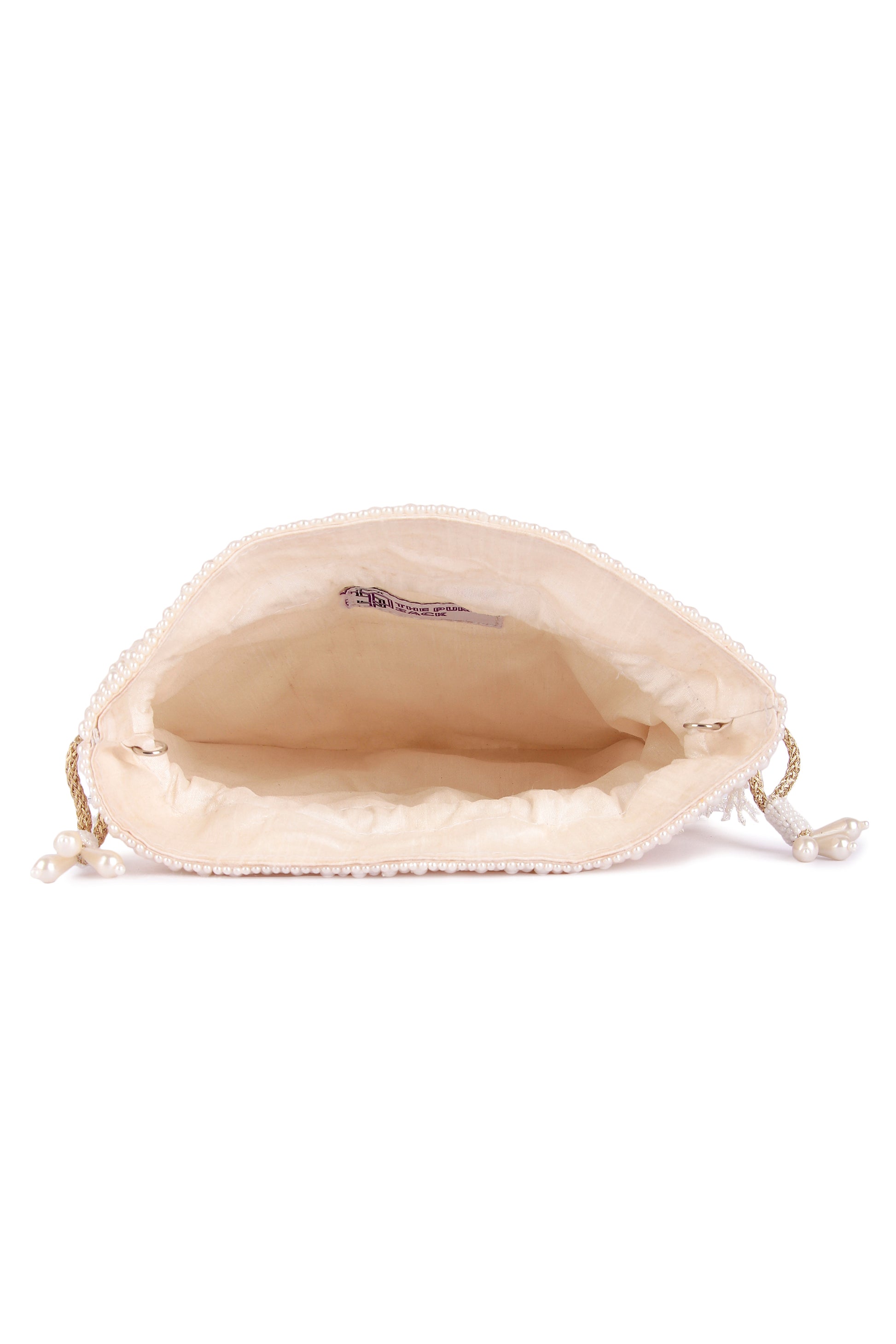 Hand embroidered classy pearl potli with detachable handle and draw strings finished with beautiful tassels.