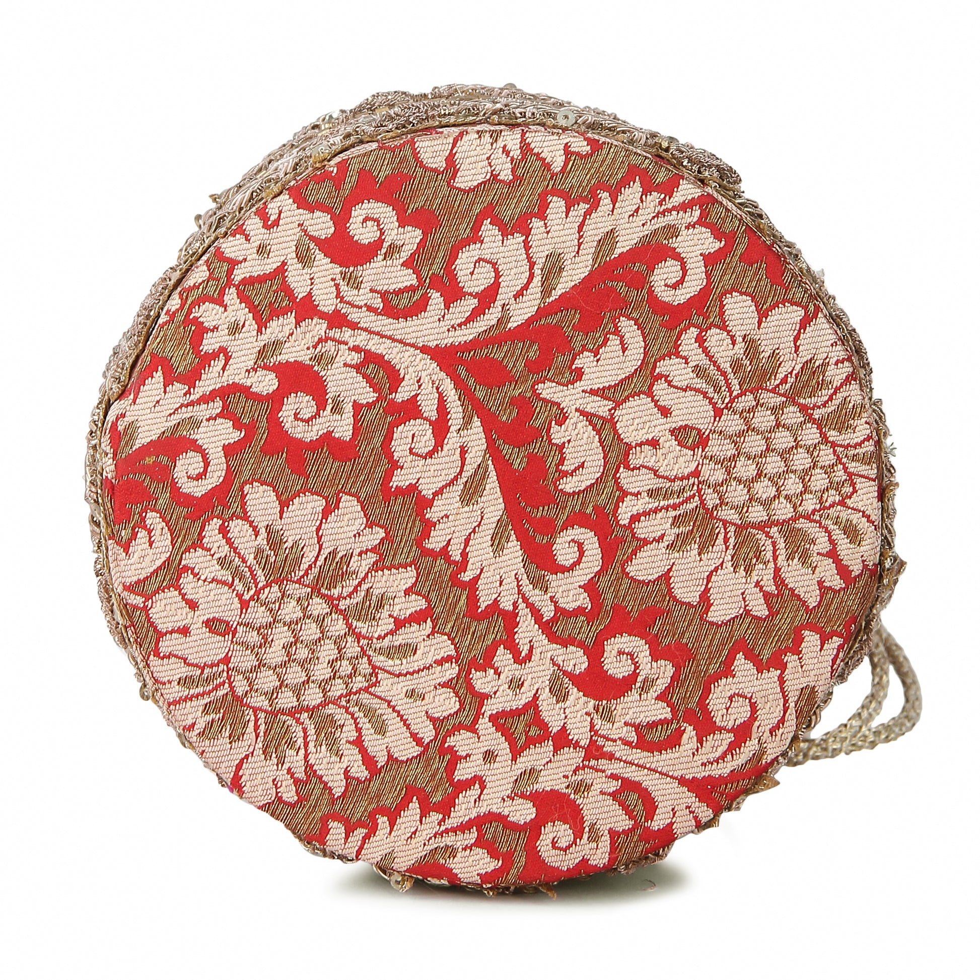 Hand embroidered potli bag with sling. Carry it with drawstrings or sling it. Color - Red