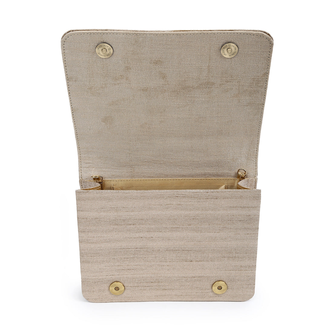 A classic clutch bag with a sling and toucan motif, all dressed in gold. This one is a must have. Color - Golden