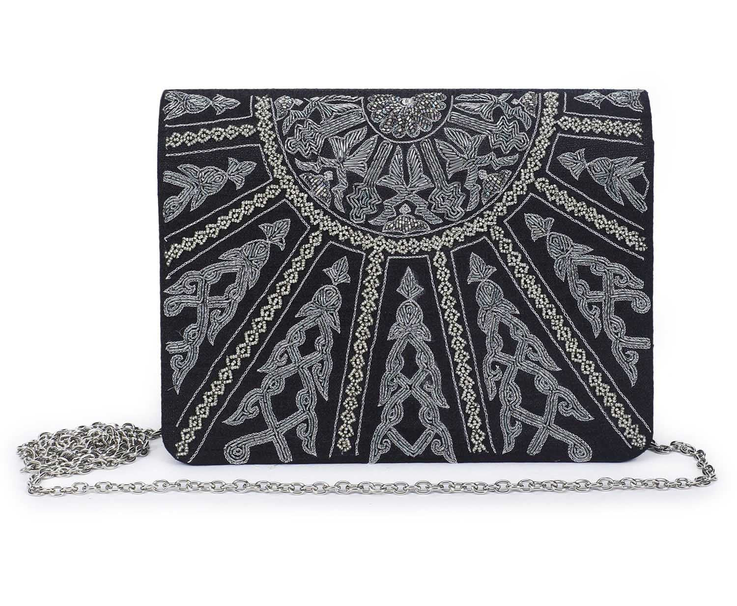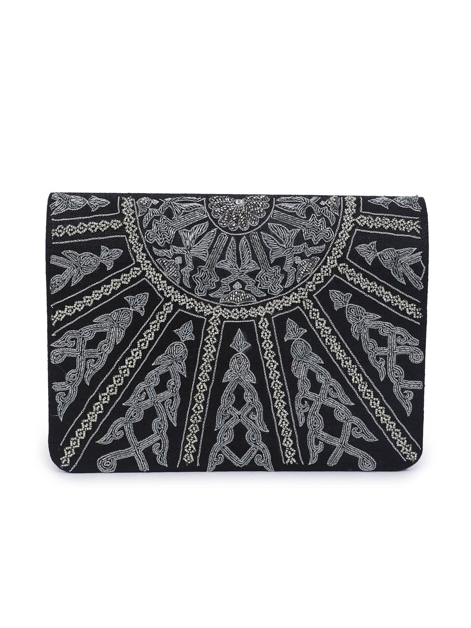 A clutch bag with a symmetric design, inspired from mughal temple motifs. Clutch it or sling it. Color - Black