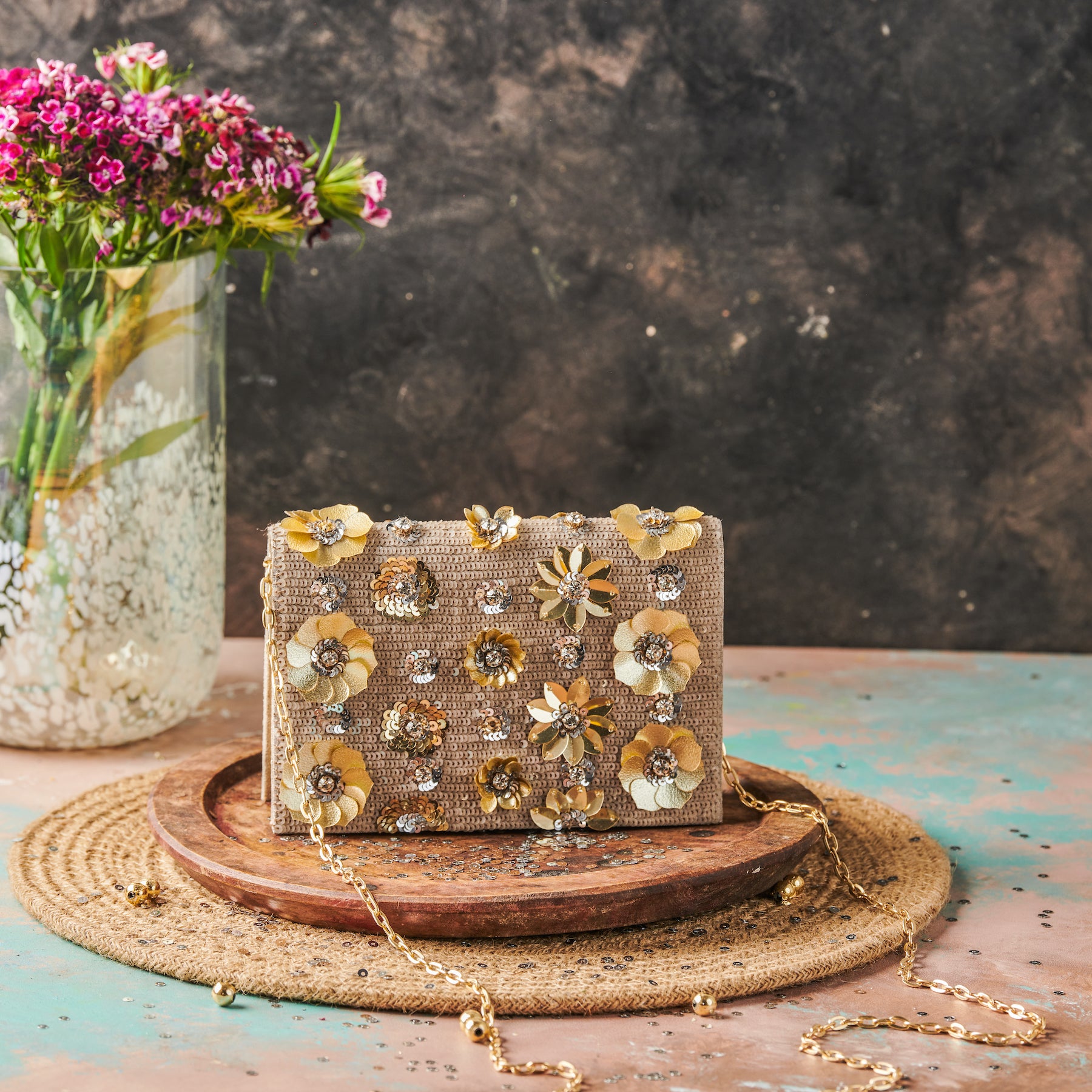 Hand embroidered and hand embellished bag with sling chain. A one of a kind accessory, that will add glam to your outfit. Color - Silver gold