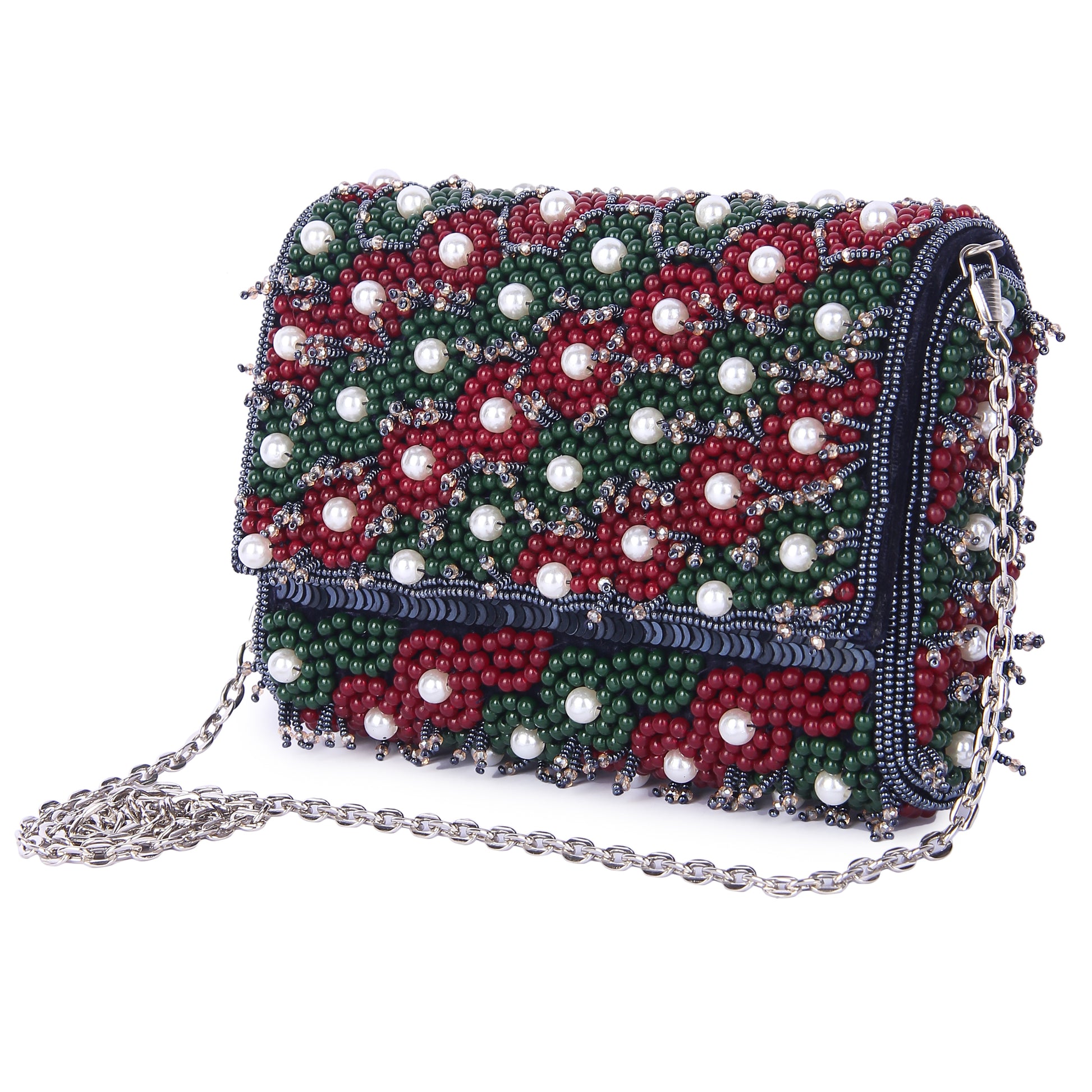 This clutch bag has an exuberant design and comes with a detachable sling chain. Carry it with the chain or simply clutch it. Color - Multicolour